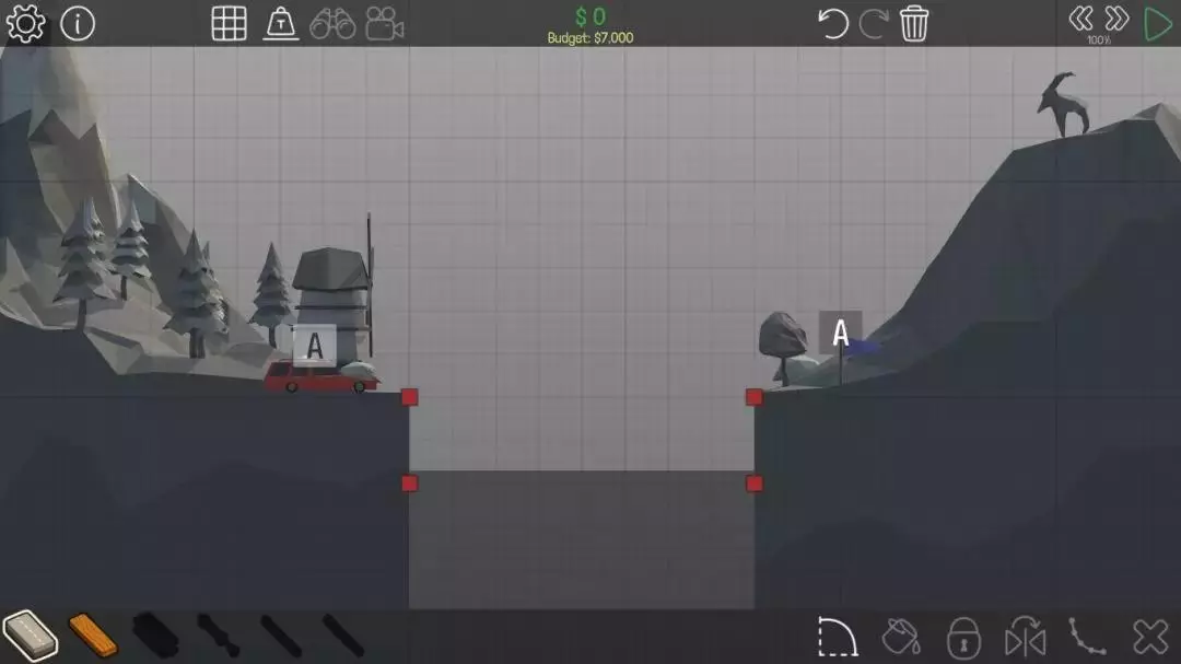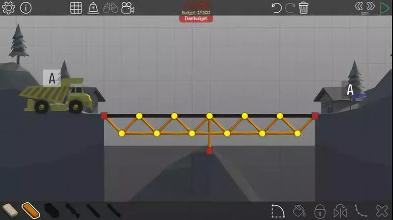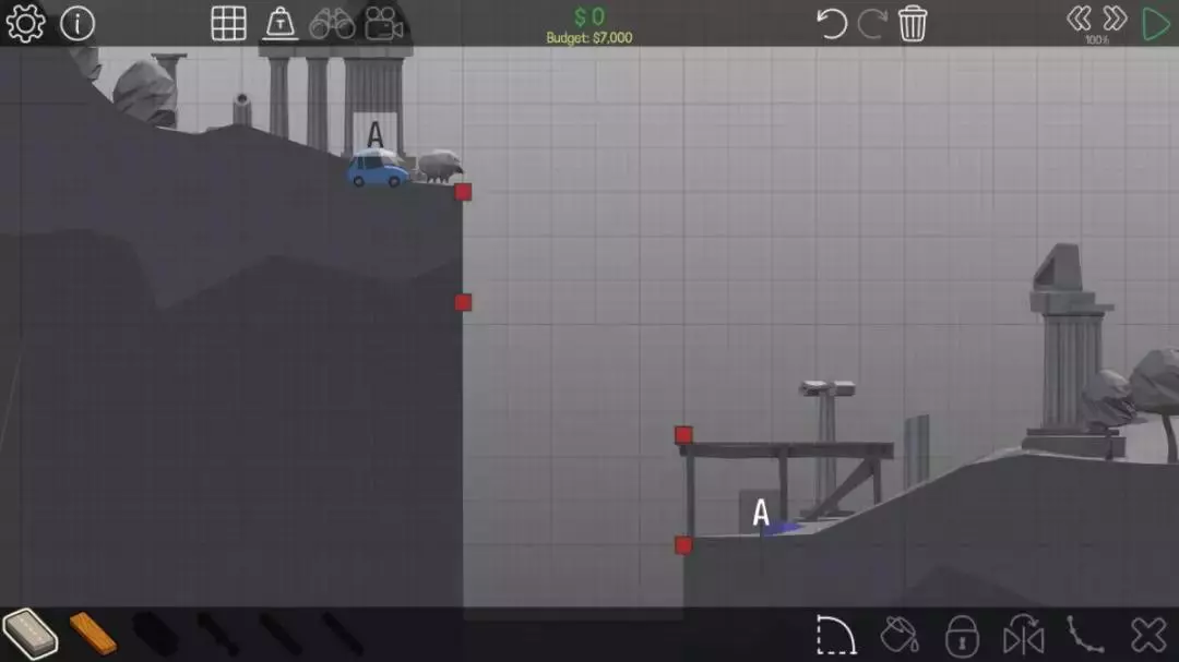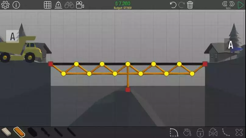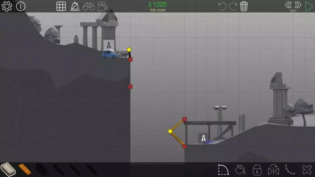 由于这辆车速度较快,会直接掉到小旗A上方的平台上无法移动。所以如果桥梁是从左上角直接铺到右下角的话,这座桥就没什么用处了。