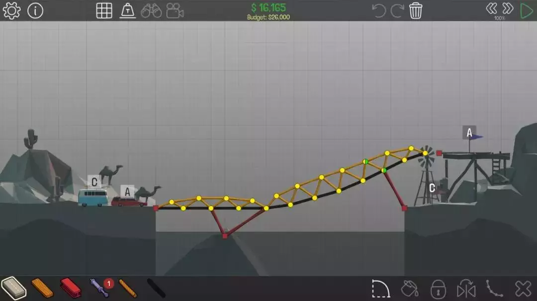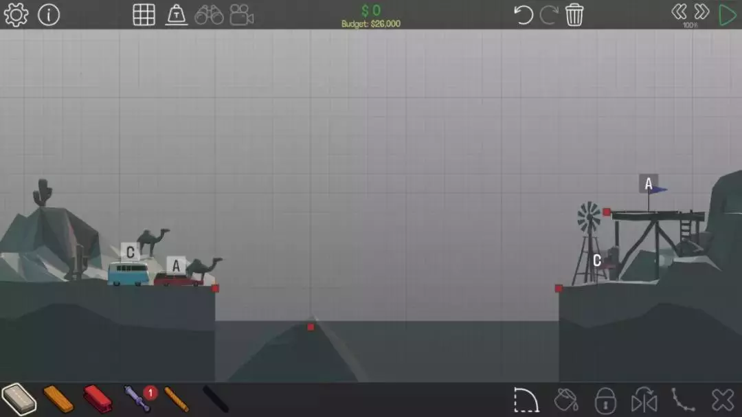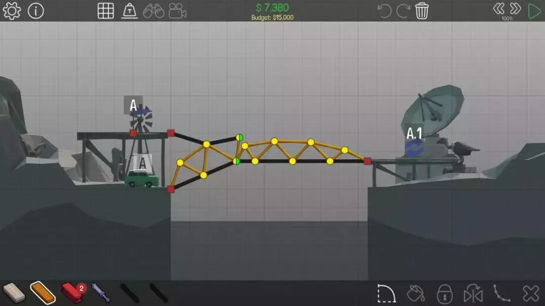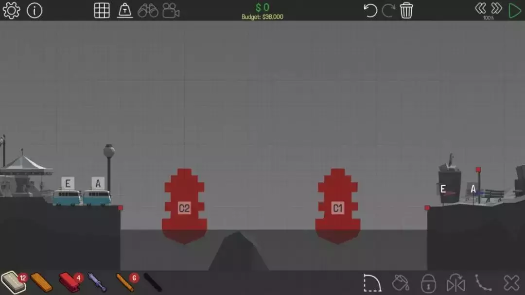 这关的主要思路是建造一座桥,先让A车吃到A旗,然后启动液压装置使桥面下降一点,C车就能吃到C旗了。不过如果能充分利用分离点,其实可以不用液压装置,在分离点断开后,C车就会有直达C旗的路线。