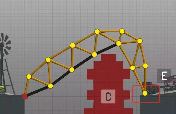 只是可怜车上的司机和乘客了,不过管它呢,能过关就行。 方法4:地基 4.并不是只有红色的节点表示可以作为地基的点,例如:地面、河的两侧墙壁、突出的岩石都可以作为受力点。 比如2-12关,A车先开,液压活动一次,然后C船行驶,液压活动一次,最后E车开。