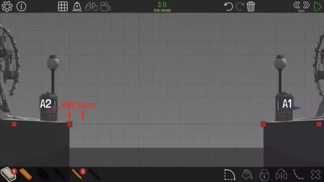 以这关为例,材料和材料数量均有限制。图中标注的网格间距为1米