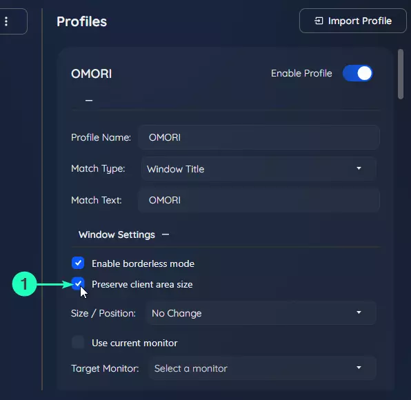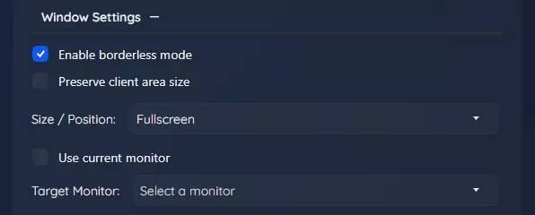 配置文件名称:在此处输入配置文件的描述性名称。 匹配类型:选择按进程名称、窗口标题或正则表达式进行匹配。 匹配文本:输入进程名称、窗口标题或正则表达式模式以匹配目标窗口。 窗口设置 此部分控制无边框游戏工具调整游戏窗口大小和位置的方式。在这里,你可以选择游戏是全屏显示、使用自定义分辨率还是保持当前大小。你还可以指定游戏应显示在哪个显示器上,这在多显示器设置或希望在不同会话间保持一致布局时非常有用。