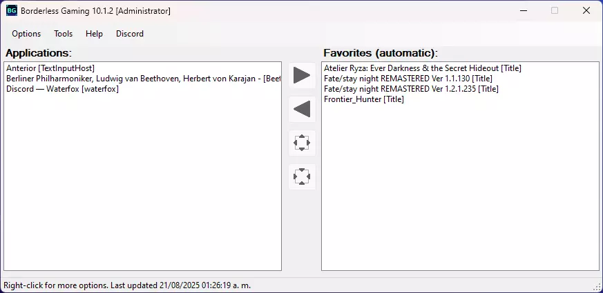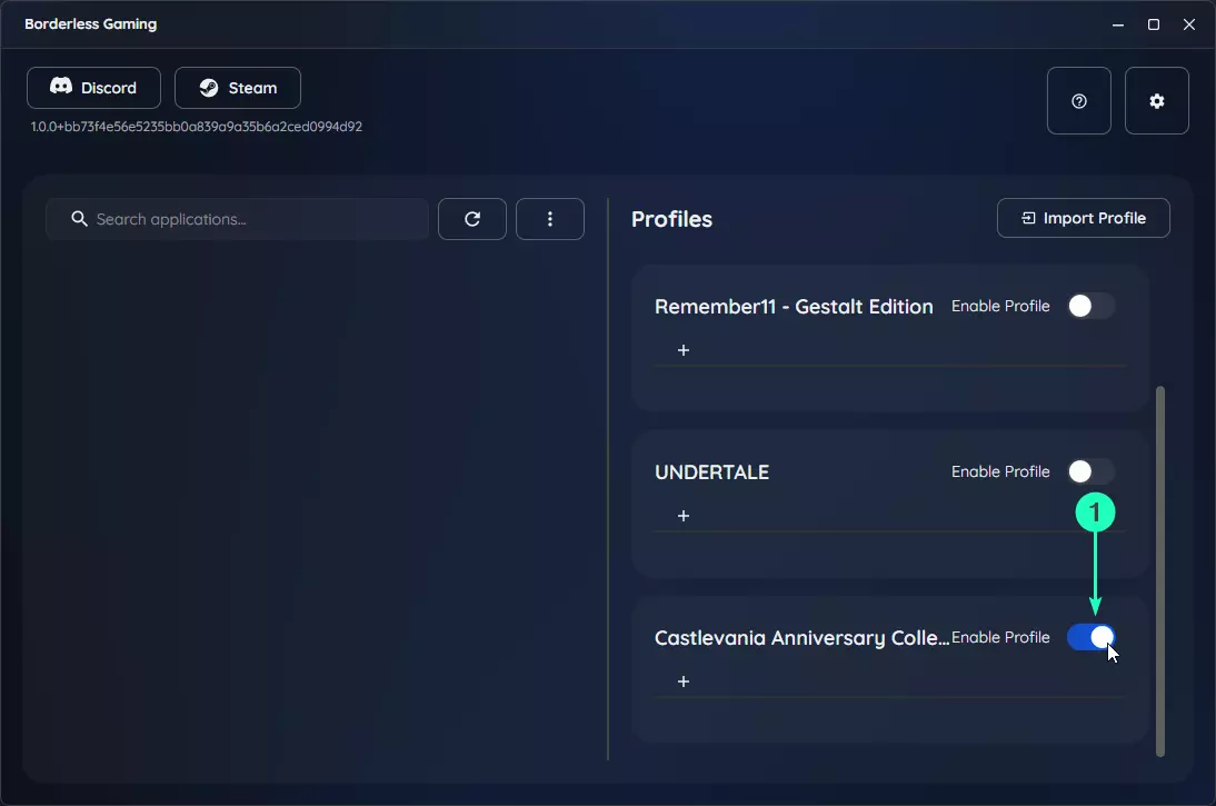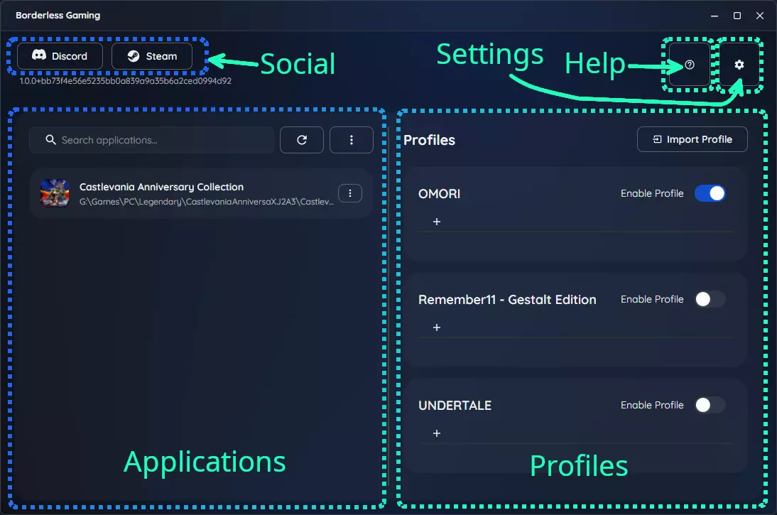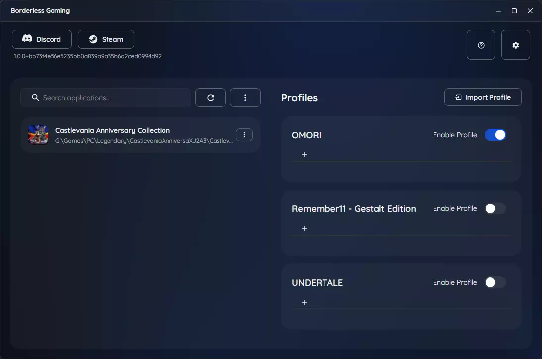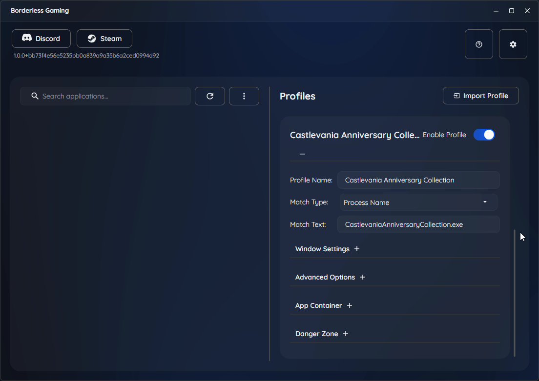 无边框游戏用户界面 社交:无边框游戏社区和支持资源的链接。 应用程序:显示当前运行的所有窗口和游戏。你可以将项目从这里移到配置文件中。 配置文件:存储游戏的保存设置,包括无边框模式、自动最大化和自定义尺寸。 帮助:快速访问文档和支持信息。 设置:全局程序设置,包括启动行为。 设置窗口无边框 要使用无边框游戏,首先确保你的游戏以窗口模式运行。这是以下所有方法的必要条件。