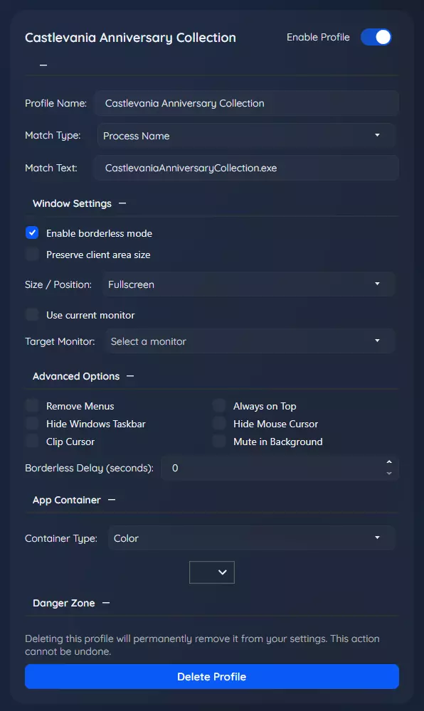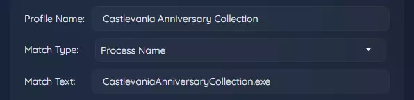 基本个人资料设置 注意:在此部分中,您还可以调整游戏的检测方式,这是在创建个人资料时进行的初始配置。如果默认方法未按预期工作,您可以更改匹配类型。要完全删除个人资料,请按底部的【删除个人资料】按钮。