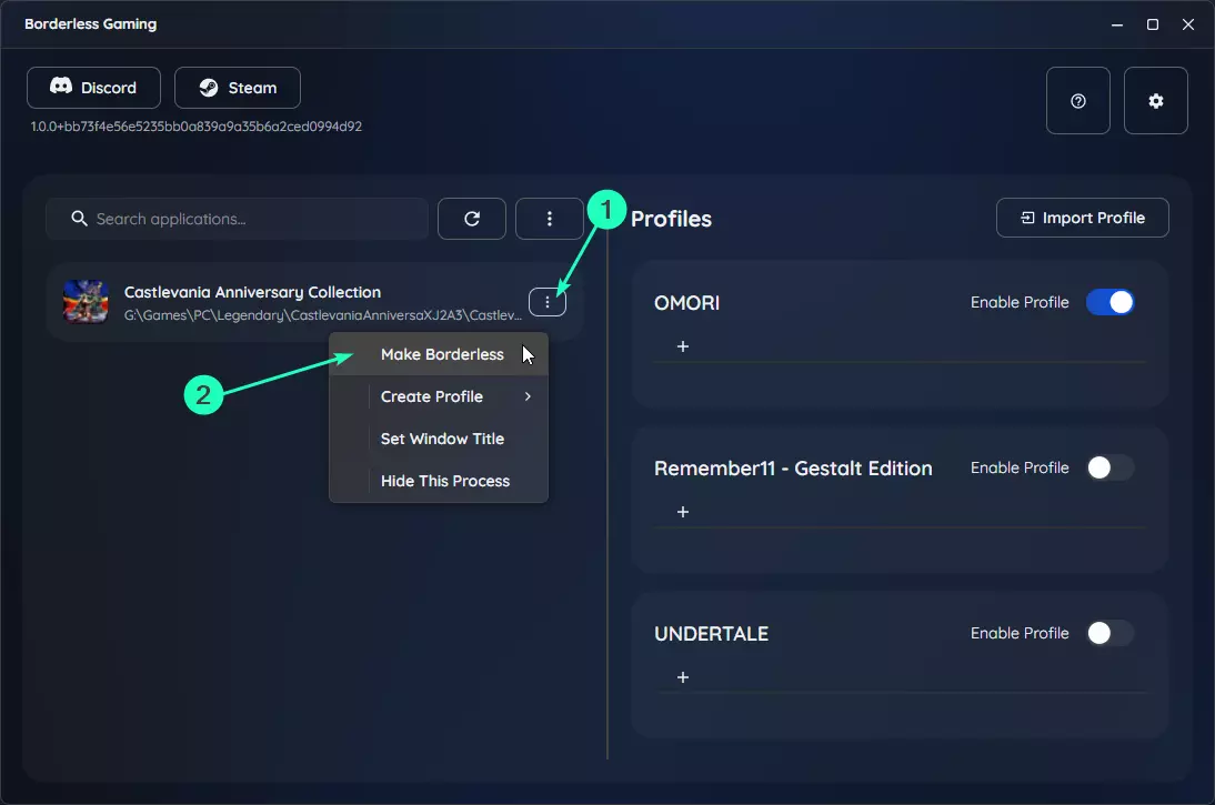 注意:在同一菜单中,你可以选择【隐藏此进程】来将其从列表中永久隐藏。这在进程不是游戏且你不希望它在未来使应用列表变得混乱的情况下非常有用。 选择【设为无边框】。 这会立即应用无边框模式,但该设置是临时的。关闭游戏后,此设置不会被记住。 方法3:使用配置文件(推荐) 配置文件是保存的设置,用于记住你希望游戏每次启动时的方式。它们可以包括无边框模式、自动最大化、自定义尺寸等。 使用配置文件通常是推荐的方法,因为它能确保你的偏好设置在多次启动时保持不变。与之前的快速方法相同,在应用列表中找到游戏,点击游戏旁的选项按钮(三个垂直点)。将鼠标悬停在创建配置文件上以打开子菜单,你会看到三个选项: