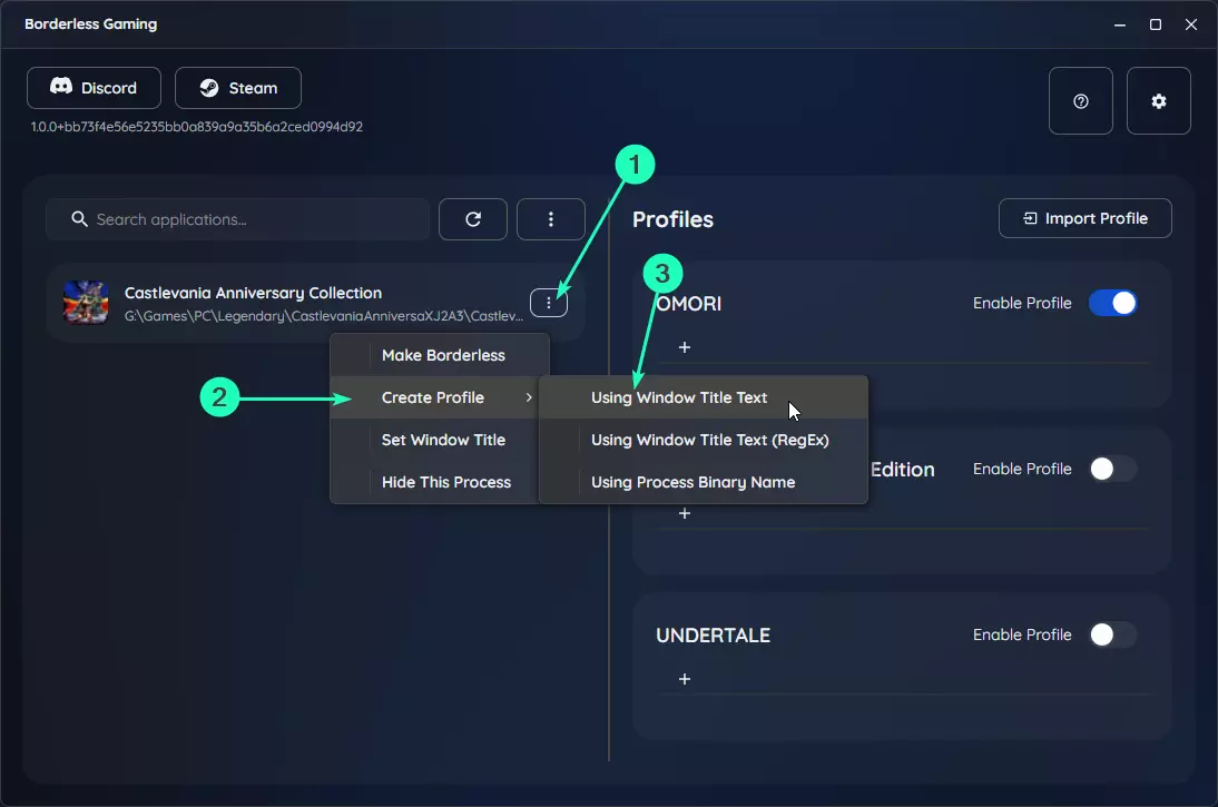 使用进程二进制名称:大多数游戏推荐使用此方式。直接匹配运行的可执行文件,对窗口标题的变化具有较强的适应性。 使用窗口标题文本:通过精确的标题匹配窗口。适用于标题固定不变的游戏。 使用窗口标题文本(正则表达式):使用正则表达式匹配窗口标题。如果窗口标题频繁变化,此方式很有用,但需要具备一定的正则表达式知识。 点击最适合您游戏的选项。 在配置文件部分启用已创建的配置文件,这样游戏将始终以无边框模式启动。