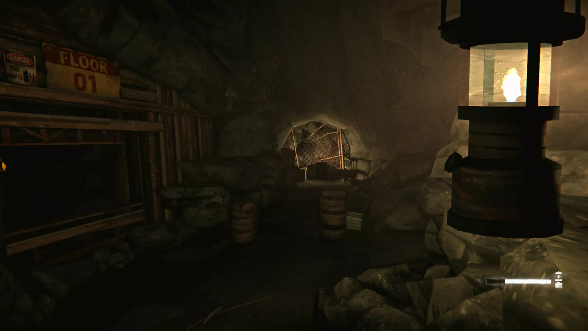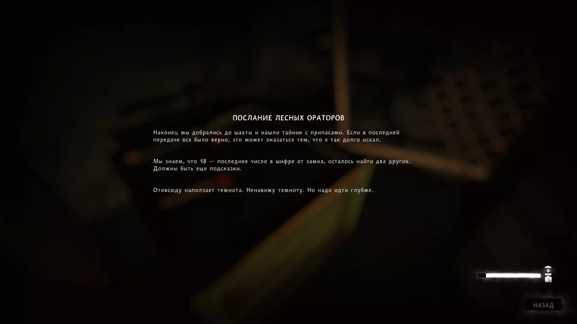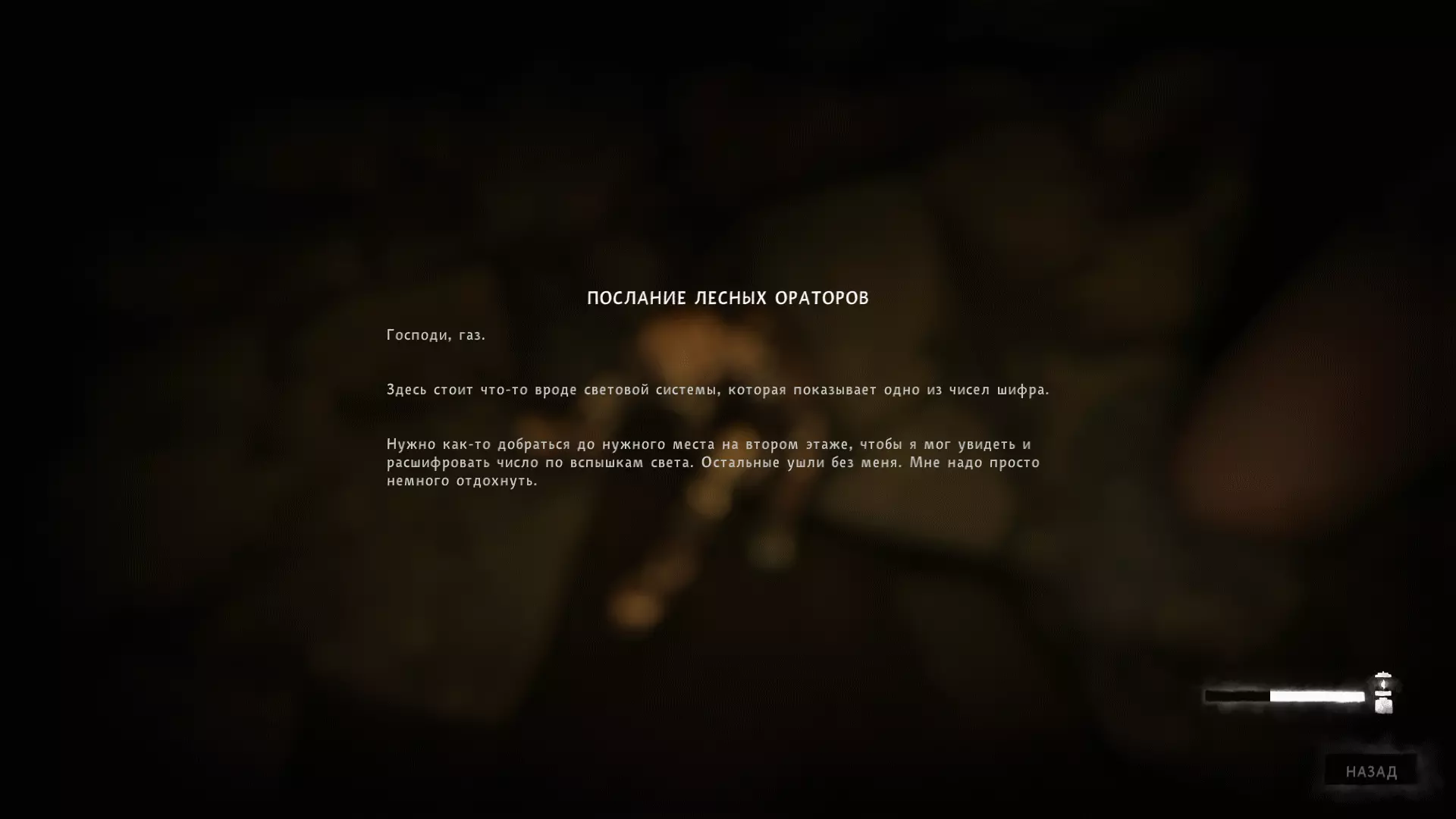锁的密码提示2:第二封带有信息的纸条可以在充满大量有毒气体的矿井里的尸体旁找到。信息中写道,需要在二楼某个特定位置根据灯光闪烁次数来破译数字。7次闪烁。