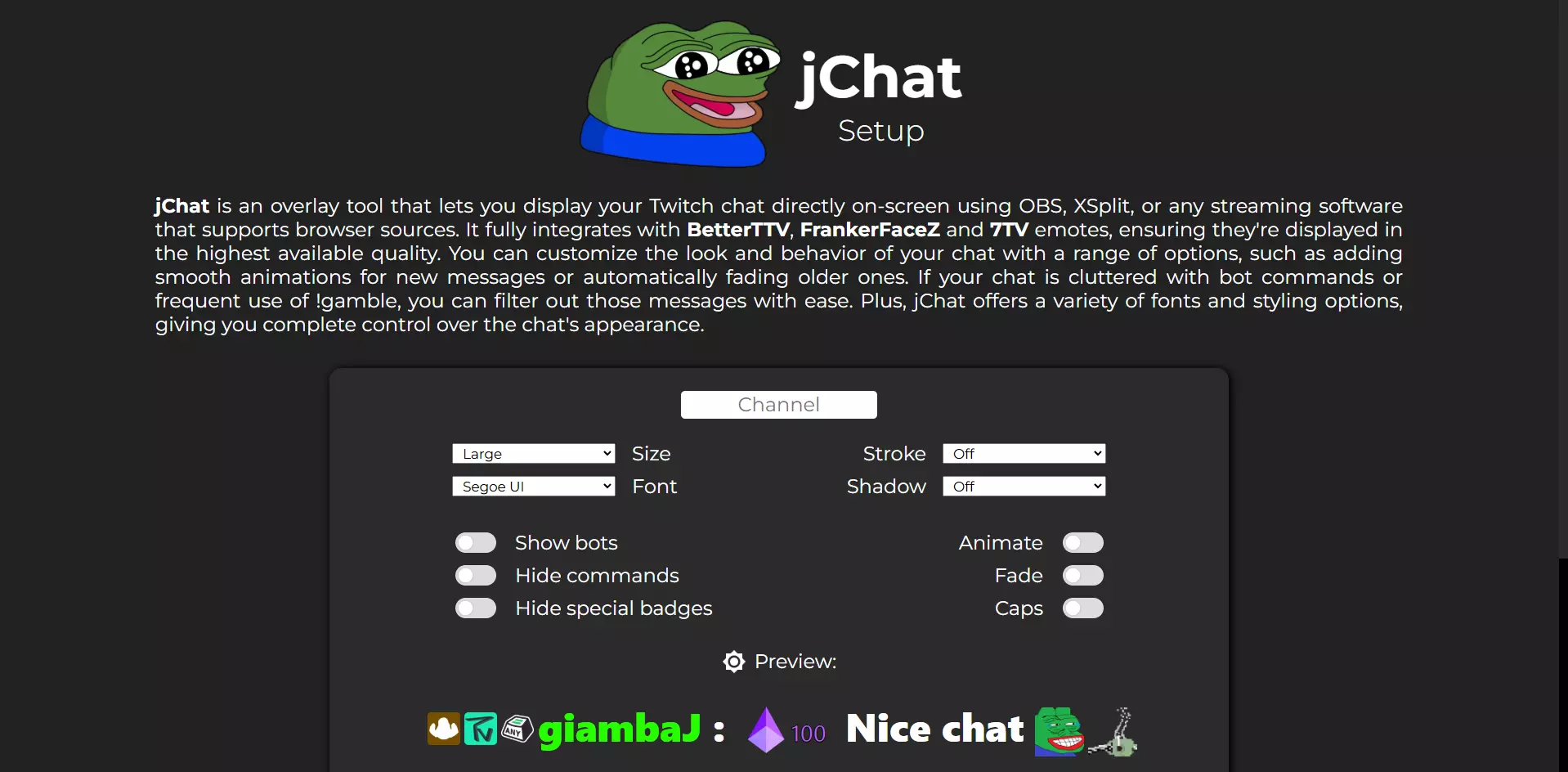 有很多方法可以为你的直播添加聊天覆盖层,但这是我最喜欢的方法,因为它简单且支持自定义表情和徽章,例如7TV、BetterTTV和FrankerFaceZ。 本指南不会展示如何激活自定义表情和徽章,默认假设用户已启用它们。不过,如果你选择不使用自定义表情和徽章,这仍然是一种为你的Twitch直播添加常规聊天框覆盖层的有效方法。 注意:此聊天框仅适用于Twitch 自定义jChat 首先访问jChat网站