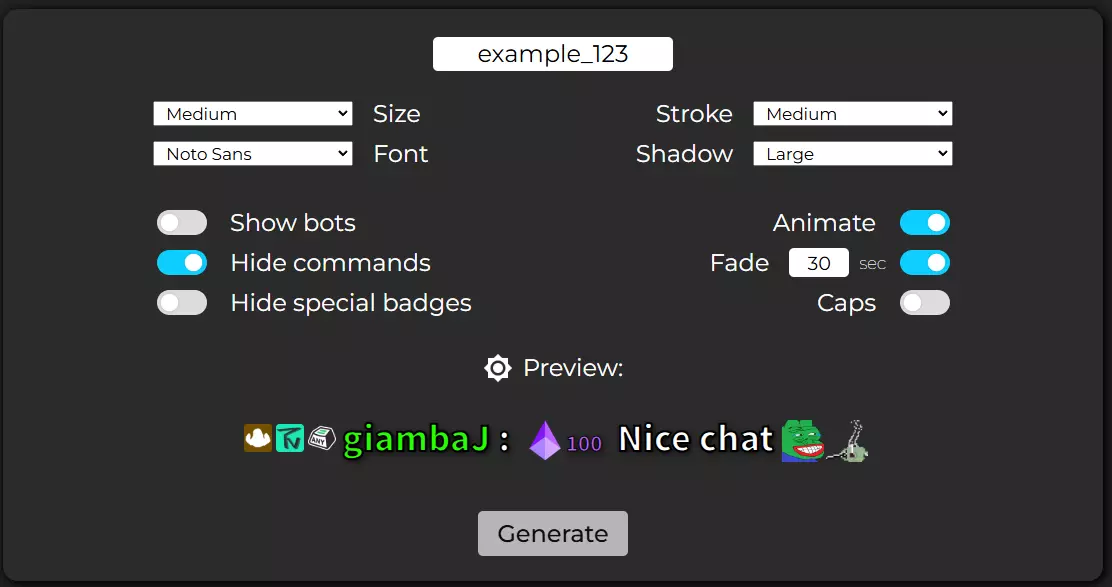 你可以通过更改字体、文本大小、阴影等设置来自定义聊天框的外观。自定义完成后,只需在默认标签为“Channel”的文本栏中输入你的Twitch用户名即可。