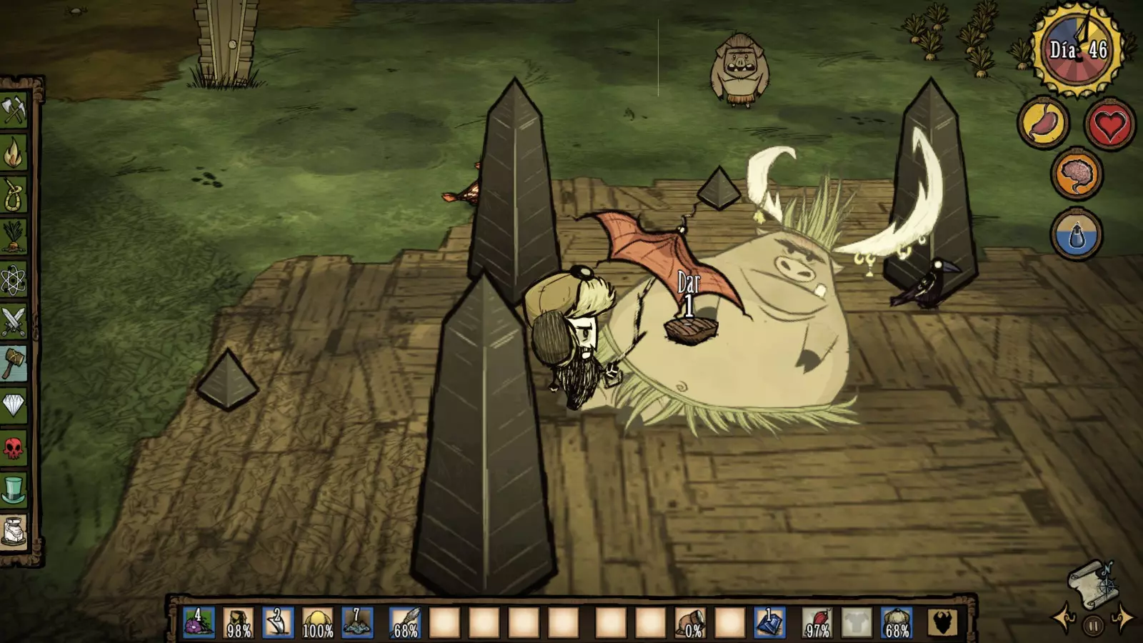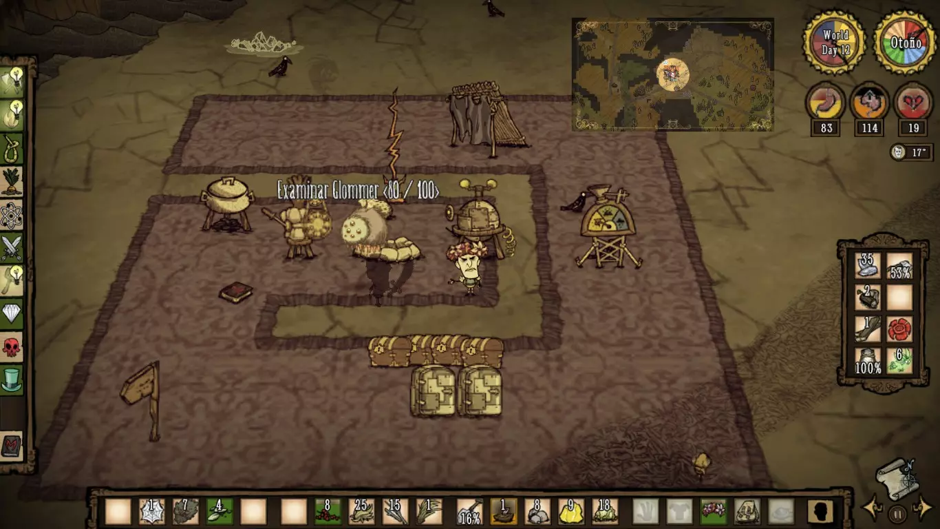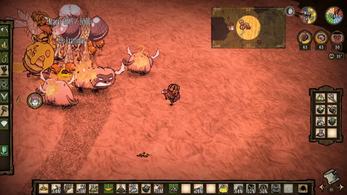 La Guardiana del Tiempo Estadisticas Salud:Se basa en la edad, comienza con 25 años y muere a los 80 años (en total posee 150 de vida) Cordura: 200 Hambre: 175 PROS -No recibe penalizaciones de vida al revivir -Posee un arma llamada Alarming Clock o Reloj despertador, que tiene el 92% de DPS (daño por segundo) de un Wolfgang en su estado Mighty o Fortachon y ademas golpea a una buena distancia -Entra a la Constante con 3 piezas de reloj y un reloj antigüedad -A mayor edad, mas daño con armas sombrías y gastara menos cordura cuanto mas se usen -Posee relojes teletransportadores que funcionan como "checkpoints" para ir rapidamente de un lugar a otro, que pueden usar tanto ella como el resto de los jugadores, y un reloj que revivira a tus compañeros en el lugar donde murieron, sin romperse Contras -No recupera años comiendo, solo la puede recuperar con su reloj antigüedad -En su etapa anciana, no puede cargar con objetos pesados y crafteara mucho mas lento -Las piezas que necesita requieren de Tulecita, que solo se puede conseguir en las cuevas, bioma donde suelen haber varias torres de relojería -Perderá 1 año por minuto que pase en la Constante -Los relojes una vez usados, entraran en enfriamiento, por lo que si necesitas recuperar edad con urgencia, no estarán disponibles (a menos que hayas hecho varios relojes) -Al revivir con el reloj que comente en los pros siendo Wanda, este se romperá Consejos Es un personaje bastante bueno, por el daño y distancia de su arma Alarming Clock, sin embargo, recomiendo a este personaje si puedes controlar su flujo del tiempo y kitear la mayoria de enemigos, no recomendado para principiantes. Datos curiosos:Te diste cuenta que los nombres de todos los Personajes comienzan en W, siendo Maxwell el antagonista del juego Don't Starve, cuyo único nombre comienza con M (una W invertida). ¿Raro o no? - Winona es la hermana mayor de Charlie... OMG.. si, así es! Si no sabes quién es Charlie, mírate este video: https://www.youtube.com/watch?v=tAjbOJBfk5U Reworks de Personajes Antes de comenzar, esta sección quedará desactualizada con el tiempo. Actualmente hasta el año 2023, se han realizado varios reworks, esperamos como jugadores que cada uno pueda descubrir los nuevos cambios y que toda la información que hayamos subido en la guía, les haya servido. A continuación, un poco de información de algunos Reworks: Wolfgang En su rework, se añadió un indicador, similar a la inspiración de Wigfrid que permite ver cuanto nivel de Musculo tiene, la velocidad a la que baja esta barra esta basada en el hambre 85+ Mighty o Fortachon 45+ Normal 45- Debilucho o Wimpy Ahora se enfoca en cuanto ejercicio hace Wolfgang regularmente, pero también vigila su hambre porque si es muy baja, perderás rápidamente el boost de su forma Mighty Tiene su propia estructura, el Mighty Gym o Gimnasio, donde puede aumentar rápidamente su nivel de Musculo levantando cosas como trofeos de mármol, bolsas gigantes, estatuas, etc, cuan mas pesado, mas rápido subirá, pero consumirá hambre a cambio, como si de una tienda se tratase, también posee pesas, que se pueden lanzar y usar para aumentar su nivel de Musculo sin usar esta estructura, no usara hambre, pero se gastaran con el uso y eventualmente se romperán, haciendo que tengas que crear otra pesa Acciones como luchar, picar, talar, etc subirán su nivel de Musculo, es una forma mucho mas lenta, pero no requiere ninguna pesa ni el Gym Consejos Si no vas a luchar, no te preocupes mucho por mantener su nivel de Musculo, puedes subirlo en base y salir a luchar cuando haga falta, eso si, ve con la barriga llena para que no baje tanto el nivel de Musculo Usar el gym puede requerir que poseas grandes cantidades de comida, prepara varios estofados de carne para que no sea un problema WX-78 En su rework, ahora ya no gana estadísticas comiendo engranajes, pero le siguen recuperando la cantidad usual de puntos (75 de hambre, 60 de cordura y 50 de vida) y no emitirá una luz cuando le caiga un rayo Ahora posee un mecanismo a la derecha de la pantalla, que muestra su Nivel de Carga de 6 ranuras, en las que puede agregarse Circuitos WX-78 recibirá varios bonus según el Circuito que se conecte, como aumentar su hambre, su salud, cordura, emitir una luz, etc, estos circuitos se desbloquean analizando criaturas vivientes con el Bio Analizador (Bio Scanalyzer), criaturas las cuales vemos en el mundo (conejos, ranas, robots, etc), una vez analizadas, el analizador lanzara Biodatos (Biodata), y al cosecharlo nos dará la receta para el circuito, según la criatura que se analice, como por ejemplo, los conejos una vez analizados al cosechar al Bio Analizador, desbloqueara un circuito de velocidad y los monstruos de la cordura te darán el circuito que mejora la cordura. A medida que pasa el tiempo, si has desconectado un circuito o fuiste congelado, perderás 2 puntos de Nivel de Carga y deberás esperar a que este se cargue, lo cual toma 1 minuto por circuito, mientras no te estés muriendo de hambre o estés mojado Si le cae un rayo, absorbe la electricidad de un Parrarayos, tomar una Leche Electrica o la energia de los generadores de Winona, obtendrá 1 unidad de carga para su Nivel de Carga Wickerbottom La actualización One For the Books introdujo 11 libros nuevos, así como un Librero para crear y almacenar libros, estos recuperaran durabilidad a medida que pase el tiempo, los libros introducidos son: Guía de supervivencia del pescador (The Angler's Survival Guide): Cuando se lee cerca del océano, aparece un banco de peces cerca. Pirocinética Explicada (Pyrokinetics Explained): Los objetos en llamas o humeantes en un radio se extinguirán y Wickerbottom recibirá un Fiery Pen con una cantidad de usos igual a la cantidad de objetos apagados, obtiene más durabilidad para los objetos en llamas, menos para los objetos humeantes. Superando la Aracnofobia (Overcoming Arachnophobia): Crea una red que ralentiza a los mobs y 