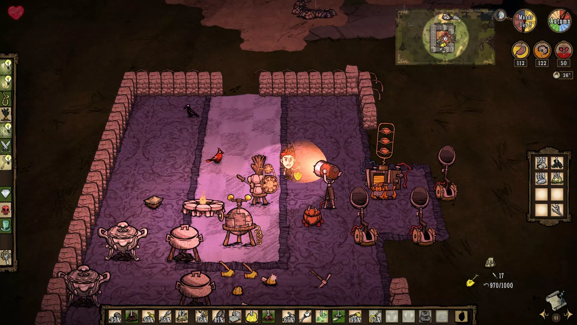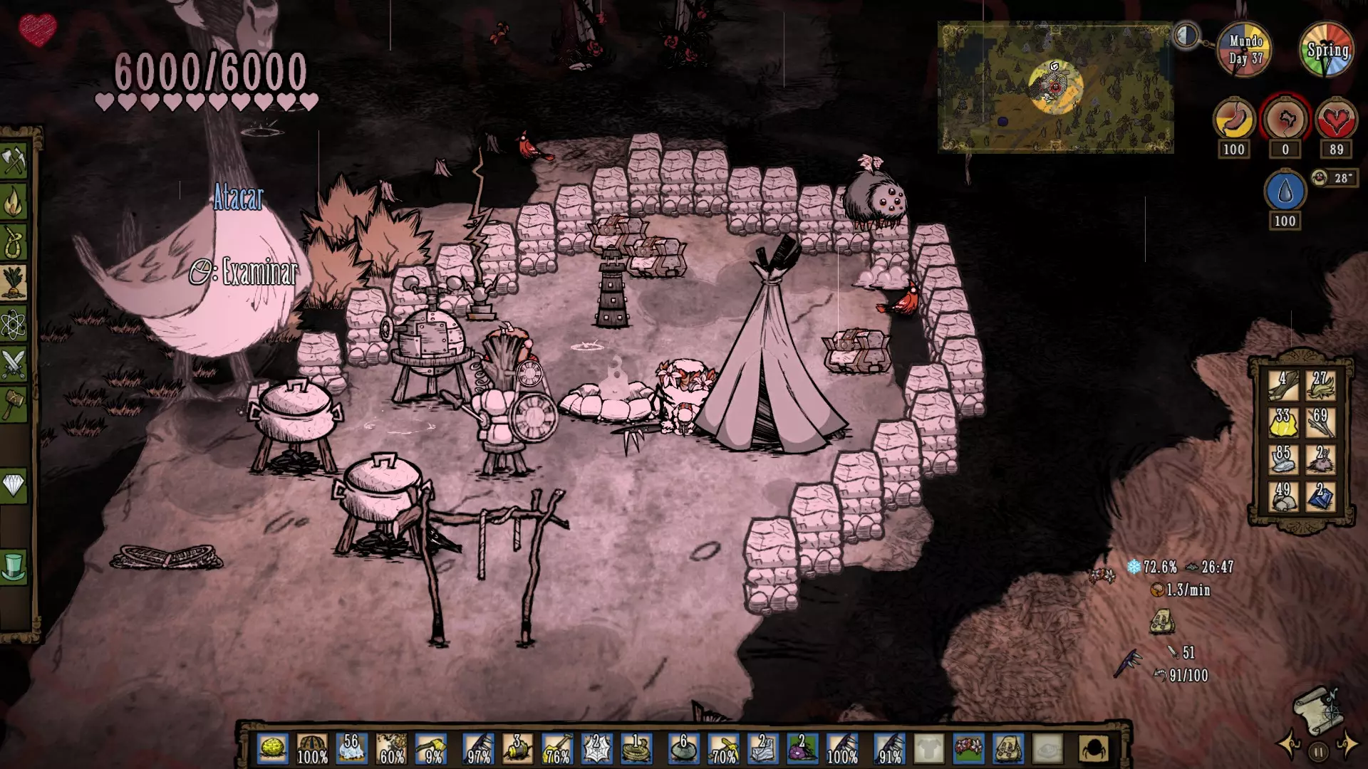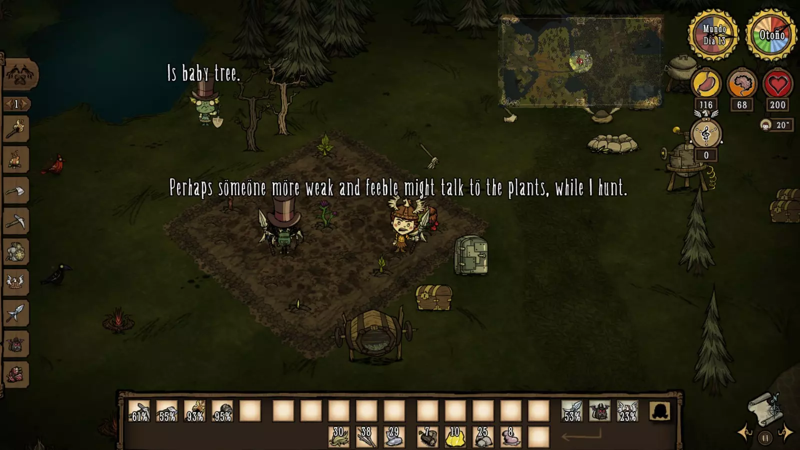La Guardiana del Tiempo Estadisticas Salud:Se basa en la edad, comienza con 25 años y muere a los 80 años (en total posee 150 de vida) Cordura: 200 Hambre: 175 PROS -No recibe penalizaciones de vida al revivir -Posee un arma llamada Alarming Clock o Reloj despertador, que tiene el 92% de DPS (daño por segundo) de un Wolfgang en su estado Mighty o Fortachon y ademas golpea a una buena distancia -Entra a la Constante con 3 piezas de reloj y un reloj antigüedad -A mayor edad, mas daño con armas sombrías y gastara menos cordura cuanto mas se usen -Posee relojes teletransportadores que funcionan como "checkpoints" para ir rapidamente de un lugar a otro, que pueden usar tanto ella como el resto de los jugadores, y un reloj que revivira a tus compañeros en el lugar donde murieron, sin romperse Contras -No recupera años comiendo, solo la puede recuperar con su reloj antigüedad -En su etapa anciana, no puede cargar con objetos pesados y crafteara mucho mas lento -Las piezas que necesita requieren de Tulecita, que solo se puede conseguir en las cuevas, bioma donde suelen haber varias torres de relojería -Perderá 1 año por minuto que pase en la Constante -Los relojes una vez usados, entraran en enfriamiento, por lo que si necesitas recuperar edad con urgencia, no estarán disponibles (a menos que hayas hecho varios relojes) -Al revivir con el reloj que comente en los pros siendo Wanda, este se romperá Consejos Es un personaje bastante bueno, por el daño y distancia de su arma Alarming Clock, sin embargo, recomiendo a este personaje si puedes controlar su flujo del tiempo y kitear la mayoria de enemigos, no recomendado para principiantes. Datos curiosos:Te diste cuenta que los nombres de todos los Personajes comienzan en W, siendo Maxwell el antagonista del juego Don't Starve, cuyo único nombre comienza con M (una W invertida). ¿Raro o no? - Winona es la hermana mayor de Charlie... OMG.. si, así es! Si no sabes quién es Charlie, mírate este video: https://www.youtube.com/watch?v=tAjbOJBfk5U Reworks de Personajes Antes de comenzar, esta sección quedará desactualizada con el tiempo. Actualmente hasta el año 2023, se han realizado varios reworks, esperamos como jugadores que cada uno pueda descubrir los nuevos cambios y que toda la información que hayamos subido en la guía, les haya servido. A continuación, un poco de información de algunos Reworks: Wolfgang En su rework, se añadió un indicador, similar a la inspiración de Wigfrid que permite ver cuanto nivel de Musculo tiene, la velocidad a la que baja esta barra esta basada en el hambre 85+ Mighty o Fortachon 45+ Normal 45- Debilucho o Wimpy Ahora se enfoca en cuanto ejercicio hace Wolfgang regularmente, pero también vigila su hambre porque si es muy baja, perderás rápidamente el boost de su forma Mighty Tiene su propia estructura, el Mighty Gym o Gimnasio, donde puede aumentar rápidamente su nivel de Musculo levantando cosas como trofeos de mármol, bolsas gigantes, estatuas, etc, cuan mas pesado, mas rápido subirá, pero consumirá hambre a cambio, como si de una tienda se tratase, también posee pesas, que se pueden lanzar y usar para aumentar su nivel de Musculo sin usar esta estructura, no usara hambre, pero se gastaran con el uso y eventualmente se romperán, haciendo que tengas que crear otra pesa Acciones como luchar, picar, talar, etc subirán su nivel de Musculo, es una forma mucho mas lenta, pero no requiere ninguna pesa ni el Gym Consejos Si no vas a luchar, no te preocupes mucho por mantener su nivel de Musculo, puedes subirlo en base y salir a luchar cuando haga falta, eso si, ve con la barriga llena para que no baje tanto el nivel de Musculo Usar el gym puede requerir que poseas grandes cantidades de comida, prepara varios estofados de carne para que no sea un problema WX-78 En su rework, ahora ya no gana estadísticas comiendo engranajes, pero le siguen recuperando la cantidad usual de puntos (75 de hambre, 60 de cordura y 50 de vida) y no emitirá una luz cuando le caiga un rayo Ahora posee un mecanismo a la derecha de la pantalla, que muestra su Nivel de Carga de 6 ranuras, en las que puede agregarse Circuitos WX-78 recibirá varios bonus según el Circuito que se conecte, como aumentar su hambre, su salud, cordura, emitir una luz, etc, estos circuitos se desbloquean analizando criaturas vivientes con el Bio Analizador (Bio Scanalyzer), criaturas las cuales vemos en el mundo (conejos, ranas, robots, etc), una vez analizadas, el analizador lanzara Biodatos (Biodata), y al cosecharlo nos dará la receta para el circuito, según la criatura que se analice, como por ejemplo, los conejos una vez analizados al cosechar al Bio Analizador, desbloqueara un circuito de velocidad y los monstruos de la cordura te darán el circuito que mejora la cordura. A medida que pasa el tiempo, si has desconectado un circuito o fuiste congelado, perderás 2 puntos de Nivel de Carga y deberás esperar a que este se cargue, lo cual toma 1 minuto por circuito, mientras no te estés muriendo de hambre o estés mojado Si le cae un rayo, absorbe la electricidad de un Parrarayos, tomar una Leche Electrica o la energia de los generadores de Winona, obtendrá 1 unidad de carga para su Nivel de Carga Wickerbottom La actualización One For the Books introdujo 11 libros nuevos, así como un Librero para crear y almacenar libros, estos recuperaran durabilidad a medida que pase el tiempo, los libros introducidos son: Guía de supervivencia del pescador (The Angler's Survival Guide): Cuando se lee cerca del océano, aparece un banco de peces cerca. Pirocinética Explicada (Pyrokinetics Explained): Los objetos en llamas o humeantes en un radio se extinguirán y Wickerbottom recibirá un Fiery Pen con una cantidad de usos igual a la cantidad de objetos apagados, obtiene más durabilidad para los objetos en llamas, menos para los objetos humeantes. Superando la Aracnofobia (Overcoming Arachnophobia): Crea una red que ralentiza a los mobs y 