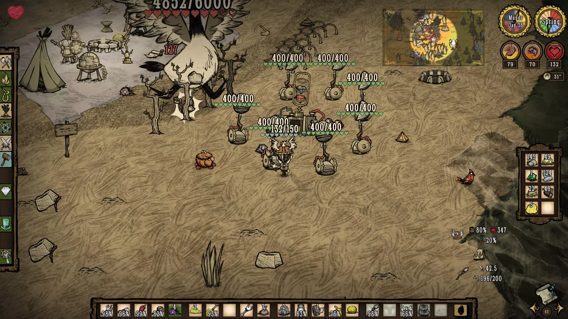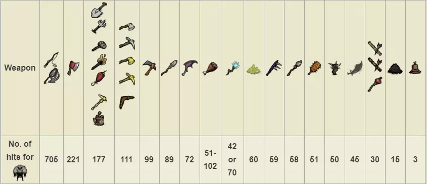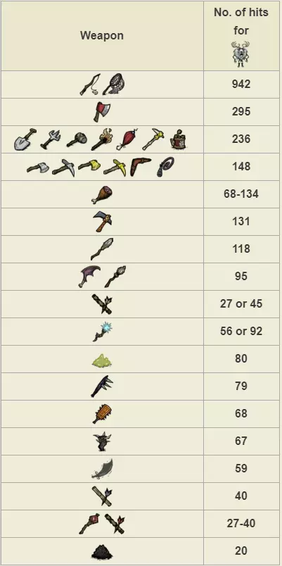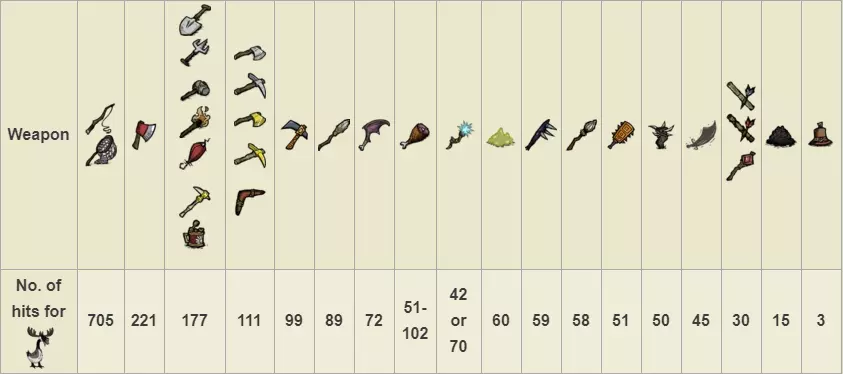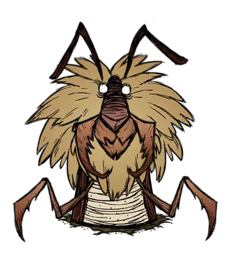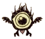 生命值:4000 对玩家伤害:75 对其他怪物伤害:100 攻击间隔:每3秒 特殊能力: 精神值吸取 - 战斗中每分钟-400,非战斗中每分钟-100 范围伤害。破坏一切。冻结其他怪物。 注意事项: 它会直接去破坏你点燃的营火。它什么都不在乎,走过时会摧毁你的整个基地,迅速远离它并在远离基地的地方与它战斗。它死亡时掉落的唯一物品【眼睛】,可用于制作【雨伞头盔】(能100%防雨)和伪科学站的【小 tulecita 防御塔】。 春季BOSS:鹅(英文名为Moose/Goose)
