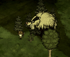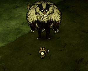 生命值:6000 对玩家伤害:100 对其他怪物伤害:200 攻击间隔:每3秒 特殊技能: - 范围攻击。 - 会去寻找地面上或隐藏的食物,优先选择蜂蜜。 - 会摧毁其行进路线上的所有物体。 - 战斗时会掉落毛发,收集足够多的毛发后,可以制作它的特殊物品。 注意事项: - 第二次进入秋季时会出现,可能从秋季第2天开始,具体时间随机。 - 如果将其唤醒,它会发出一声喵叫使你入睡,若在睡眠状态下被它击中,会受到移动惩罚,角色将处于昏睡移动状态。 - 每攻击3次,第4次攻击为范围攻击。 - 攻击它3次后拉开距离躲避其攻击,然后再次进攻,重复此过程。- 它可能会出现,但不会出现在你的基地,因为它寻找蜂蜜的优先级比追逐玩家高3倍。 - 它死亡时的唯一物品是它的毛皮,可用于制作一件背心和一个保温背包。