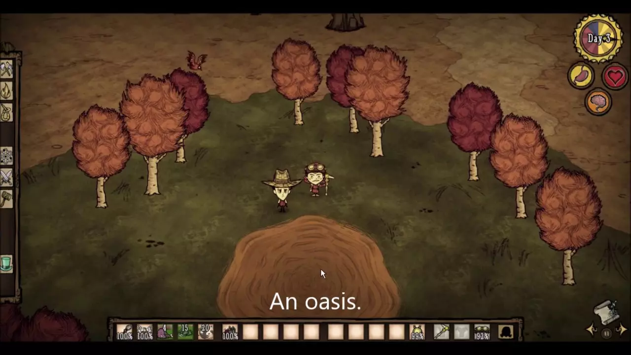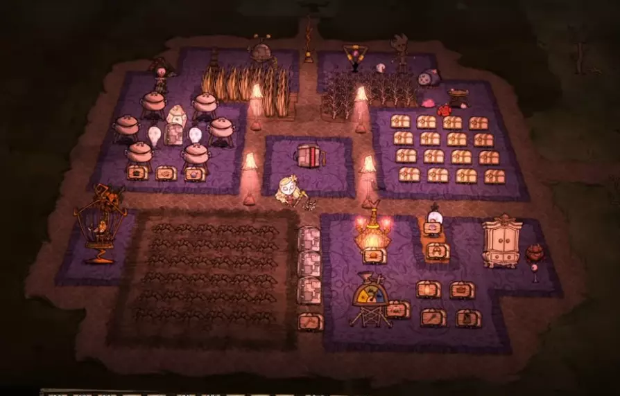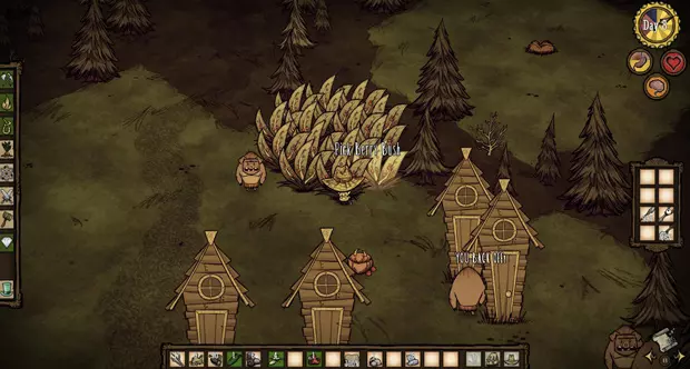 第11天至第100天 现在是时候建立我们的基地了。在游戏初期,不建议整天待在基地里,这是个非常糟糕的主意。最好是建造科学机器、避雷针、一些用于存放物品的箱子、石头篝火,然后外出寻找材料,并尽可能将找到的材料带回基地。铲子是游戏中极其重要的物品,因为你可以用它从地上挖取小树枝灌木、割下的草和浆果丛,以便将它们种植在基地附近,目的是让基地在未来实现自给自足。 你将在最初的80天里,不得不与各个季节的首领战斗,相关信息我们会在下方列出。关于每个季节的生存技巧也一样。基地及其位置 不要将你的基地建在:陨石坠落的地方