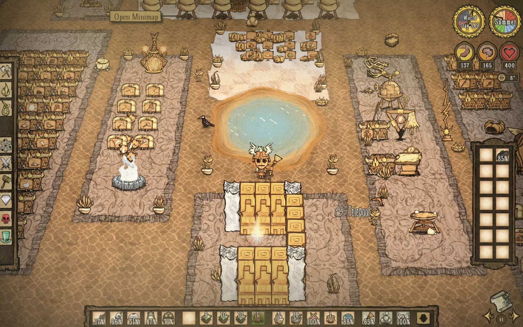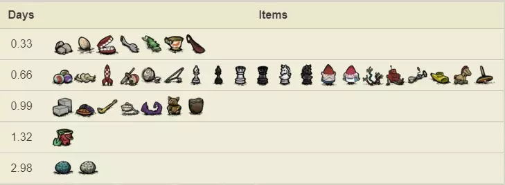 随着最新更新,海洋发生了变化,成为了可探索区域,并且新增了新怪物和一个名为【月岛】的生物群系。不过本指南不会包含这部分内容,因为它与指南的主题和目标无关。 第10天或第11天 重要提示:如果你是精神值(san值)有问题的角色,或者不太清楚如何管理精神值,建议在这几天内的月圆之夜前往【橙林】生物群系,寻找【格洛姆雕像】,并收集只在当晚出现的花朵,这样可以获得一个同伴,它在你附近时会降低你的精神值,同时每2天生成一次燃料。在雕像附近你会找到【排箫】,这对对抗某些首领非常重要,一定要保存好!