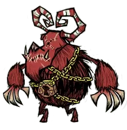 当你的邪恶等级达到最高时会出现(背景噪音会提示你当前等级,声音越大,等级越高),它会拾取地面上看到的所有物品。在没有护甲的情况下,攻击你会造成50点伤害,如果你没有护甲,避免召唤它。它的攻击速度很快,所以最好扛住攻击或者一击后闪避。 不过,这个敌人有1%的概率掉落【Krampus Sack(坎普斯背包)】,这是游戏中最好的背包,不会被烧毁,并且可以存放非常多的物品。克劳斯也会召唤这个敌人,它们会立即攻击你。当数量很多时,使用潘笛让克劳斯和坎普斯入睡,然后逐个击杀它们。 电山羊 700