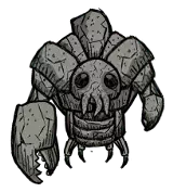 生命值:6000 对玩家伤害:50 - 75 - 100(根据技能等级) 对其他怪物伤害:100 - 150 - 200 攻击间隔:每4秒或每6秒 特殊技能: 会生成大量石刺,在战斗中对玩家造成伤害。还拥有将你困在石牢中的技能。不会进行物理攻击,但会使用上述召唤技能。 注意事项: - 如果你给它一块【冻结的热石】,它会吃掉石头并被冻结,此时战斗开始。 - 战斗开始时持续攻击它,直到它准备召唤石刺,石刺很容易躲避。 - 在与这个首领正面战斗前,你需要在绿洲中钓出两个蓝色物品,一个是【时尚眼镜】,另一个是【沙漠眼镜】,装备后者可以在沙暴中移动。(创建它需要2个猪尾巴和1个金块) - 它是游戏中地震和塌方的引发者。 - 它的机制类似猪王,如果你想避免它用地震攻击你,就必须给它祭品,比如石头或玩具。(每种物品都有一定的时效,例如给它一个玩具,大约可以保证1天不被攻击) - 它死亡时留下的沙漠石,可用于建造【懒惰探险家】,这是一种允许你传送的结构。使用时需要2个该结构和2名玩家,一名玩家在结构A进行引导,若玩家2在结构B点击该结构,就会传送到结构A(-50理智值)