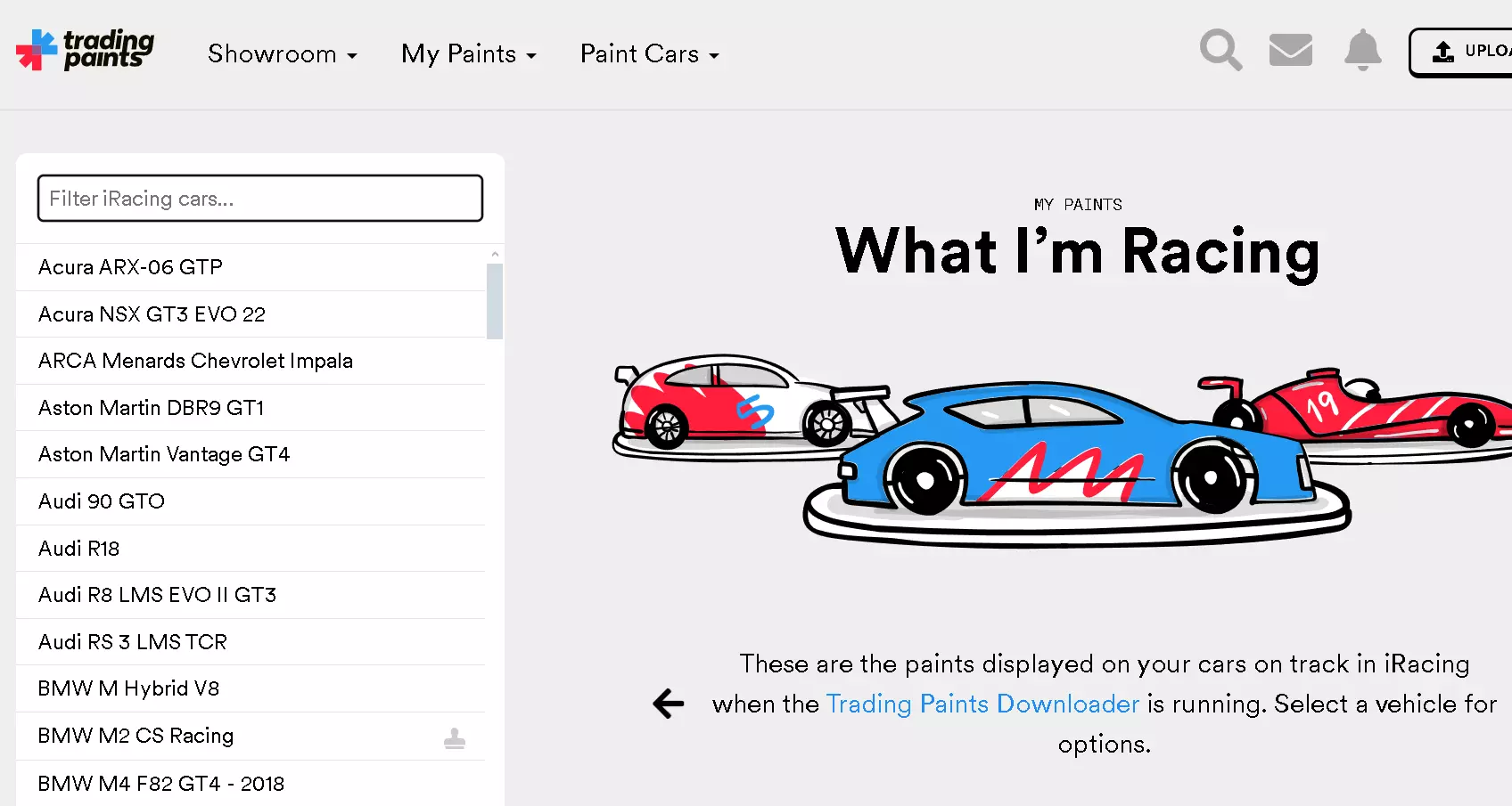 完成这些步骤后,安装就完成了。该应用程序将在后台运行,但不用担心,它几乎不会占用电脑性能。 选择并挑选外观/涂装 在Trading Paints网站上,需要进入“showroom”部分。在那里,顶部有筛选器,可用于选择你想要寻找外观的车辆。