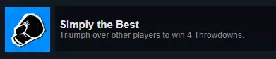 要获得此成就,需与其他玩家对战并取得4场胜利。在游戏中按住箭头键,进入【Throwdawns】,进行2人1分钟的对战。你也可以和朋友一起完成。这需要时间和反复刷取。