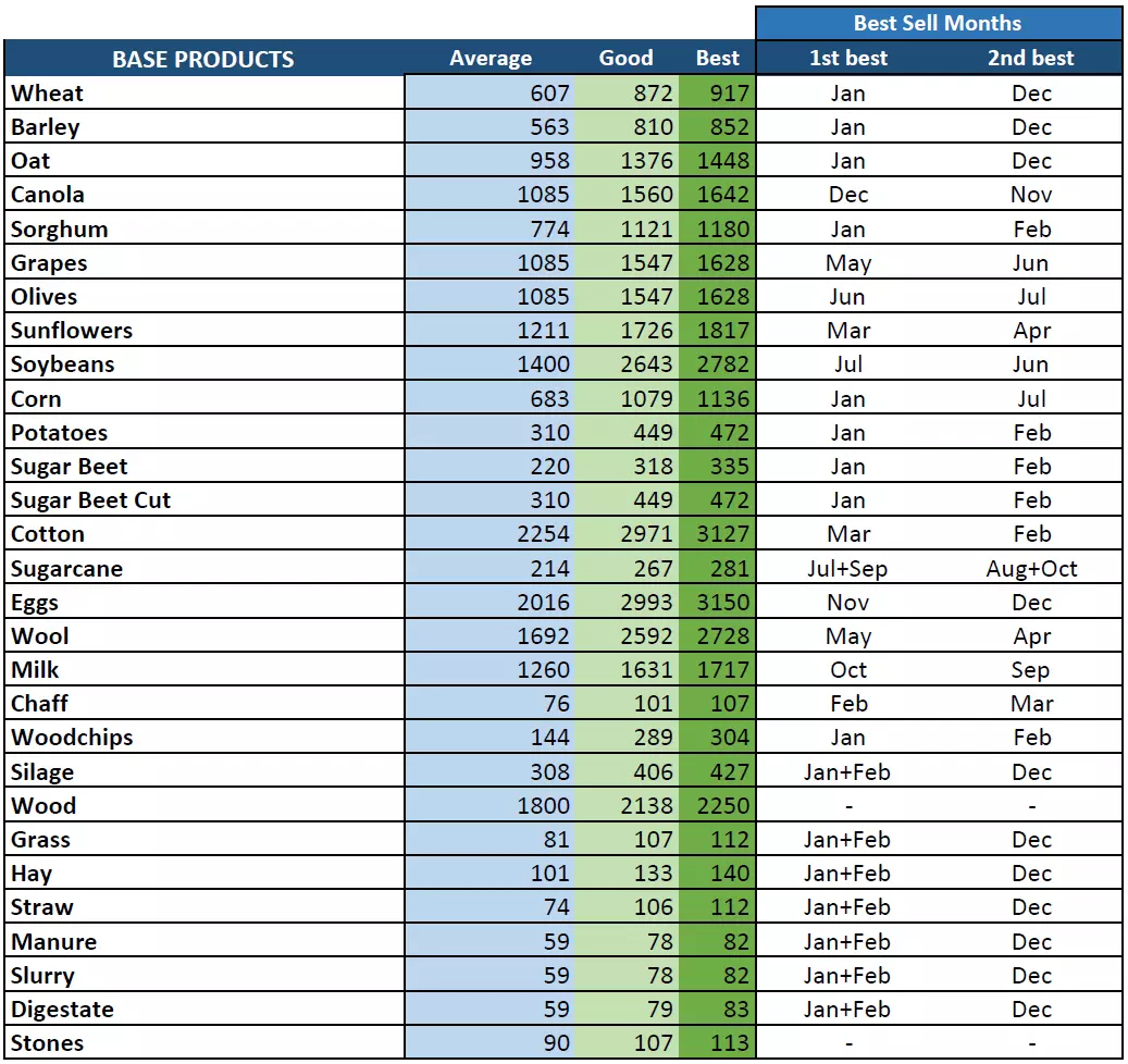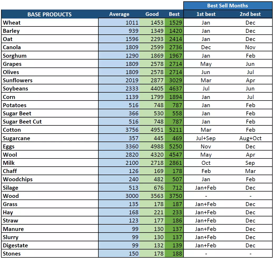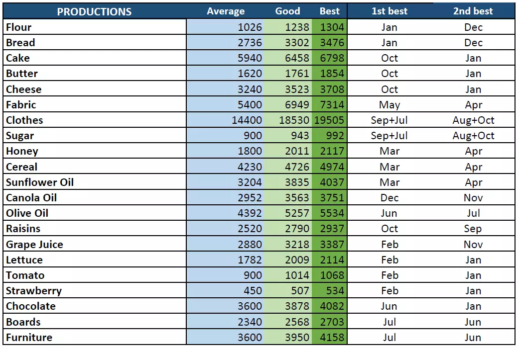 本指南将帮助你在合适的时机以最高价格出售产品。 说明: 每个游戏难度下,基础产品的平均售价取自游戏文件,会根据最佳销售月份应用一个乘数系数,最高可获得25%的加成;而通过在我的网站上进行大量测试得出的产品,最高可获得5%的加成。如果你发现更高的数值,请在本文档中留言反馈。 正如许多人所注意到的,游戏推荐的最佳销售月份有时并不准确。把握最佳销售时机的最好方法是密切关注价格变化并每月查看。当价格达到【良好】水平时,你就会知道价格不会再有太大涨幅。基础产品售价