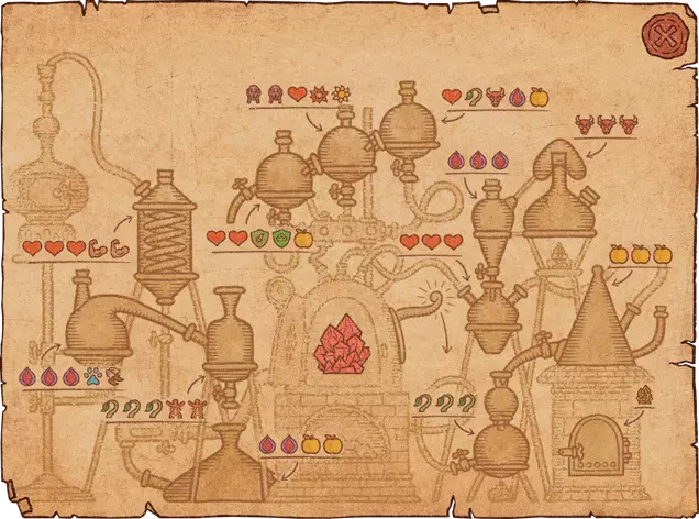 不要忘记,您可以使用装水的桶来移动到中心区域。 重要说明:显示药水的符号表示所需等级,而非数量。顺序本身无关紧要,您无需严格按照列表顺序收集(例如,如果显示“火焰”“寒冷”和“爆炸”,您可以按任意顺序收集它们)。