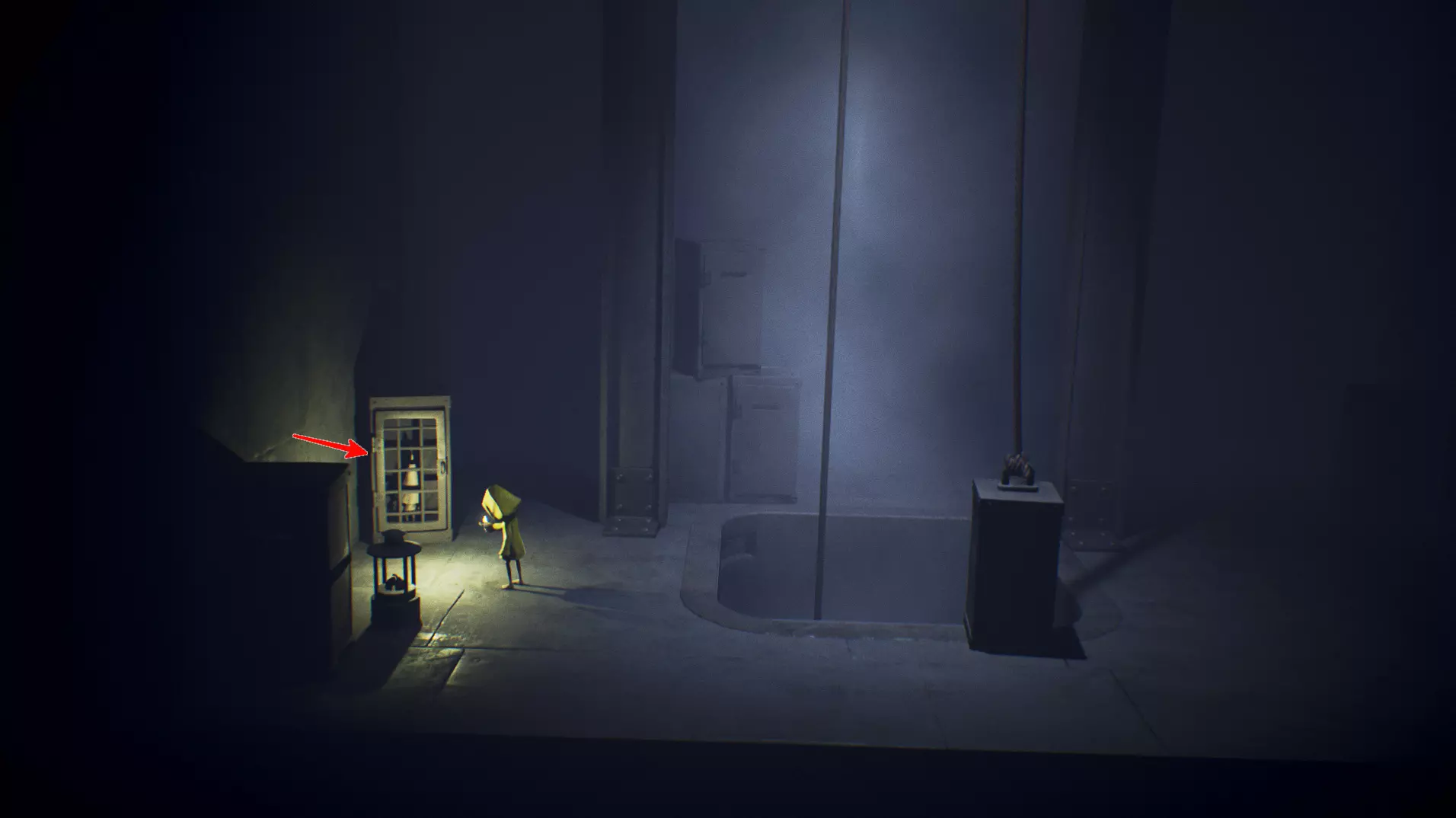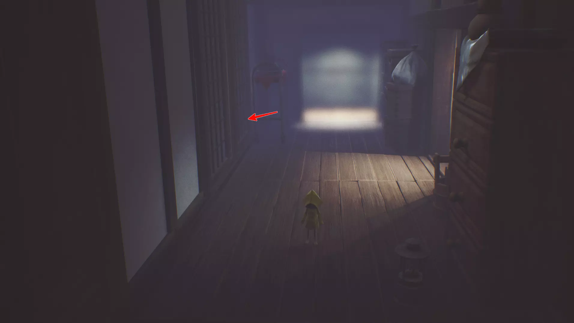 迷失的小生物 1/13 启示 2 在墙壁上有冰箱的房间里,右侧有通道。这里有两个物品:【 ном 】和灯。
