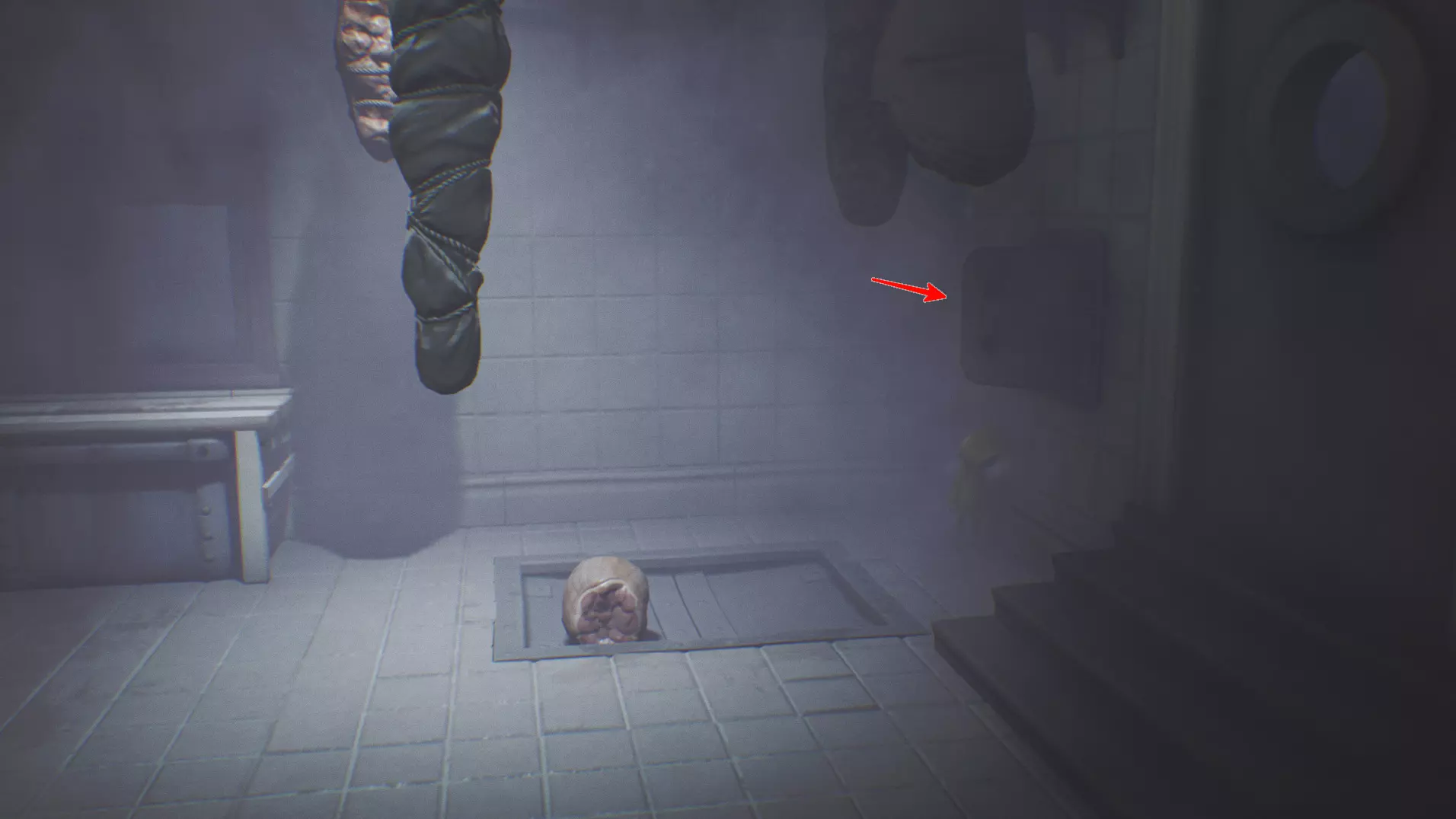 在坠入地板下方后,在“梯子”附近。