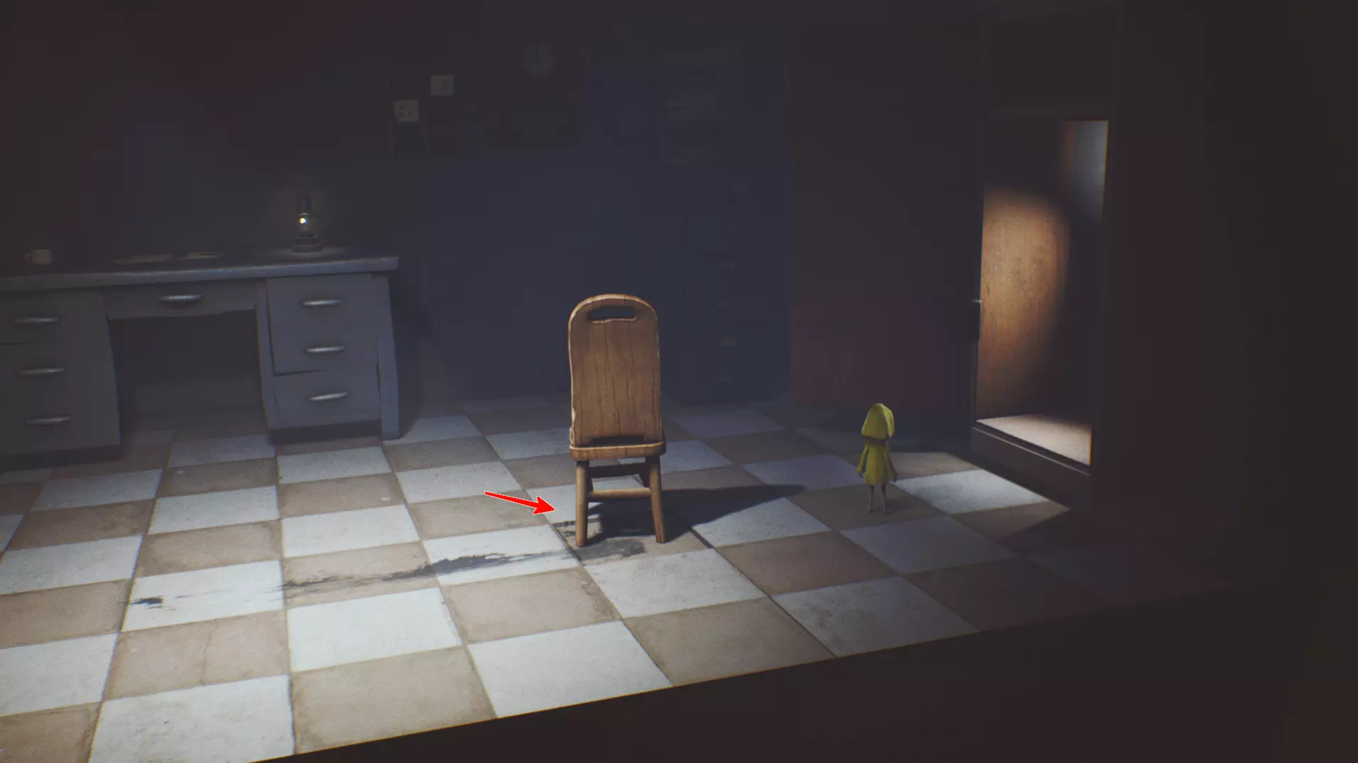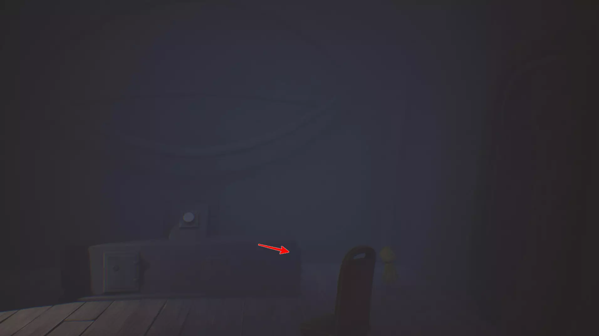 迷失的小生物 4/13 在第一个房间需要打开通往秘密房间的通道。把椅子拖到踏板地砖上。【ном】藏在“装置”后面,需要绕到它旁边引诱它。它会逃跑,然后坐在楼梯平台上。