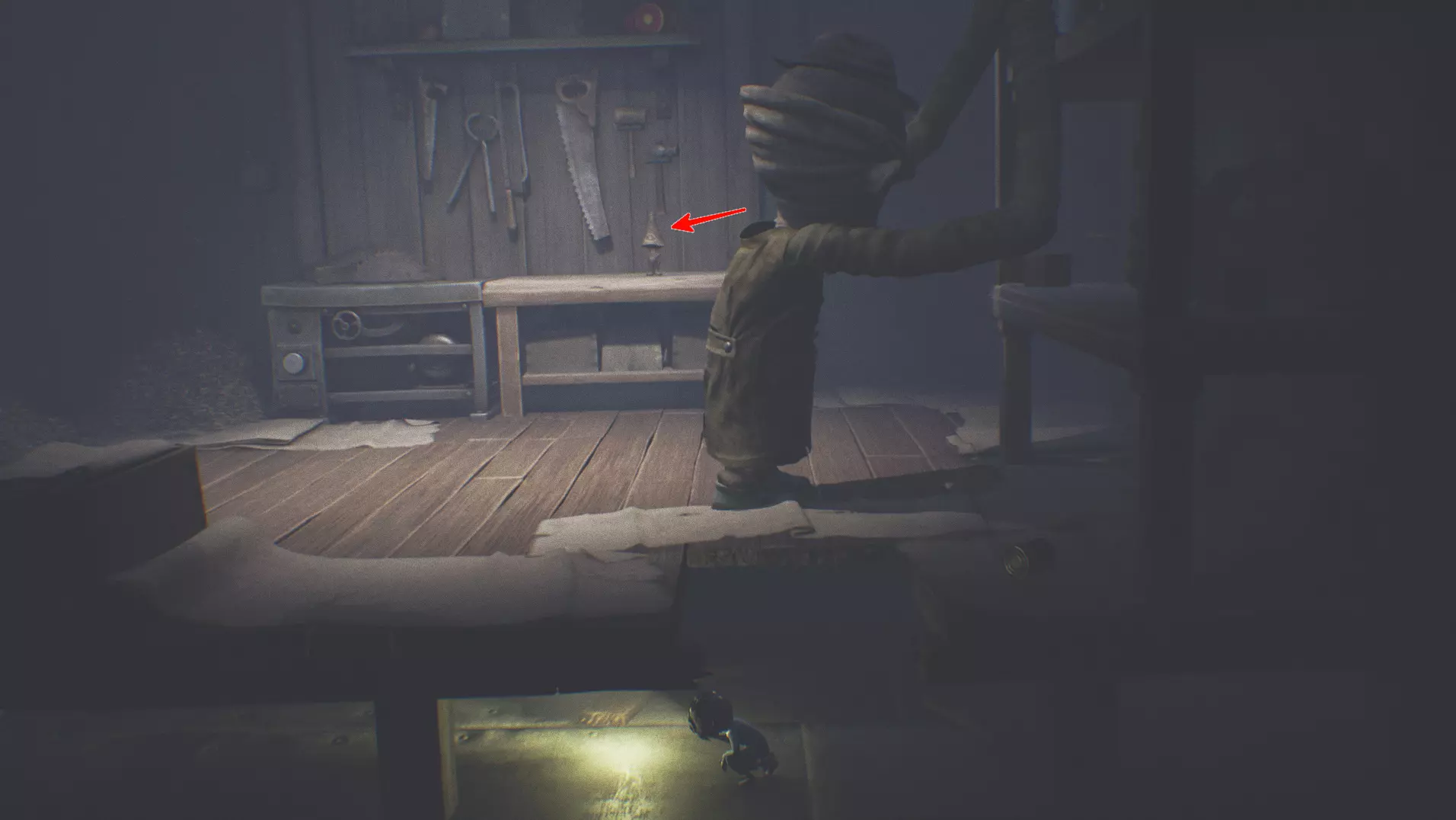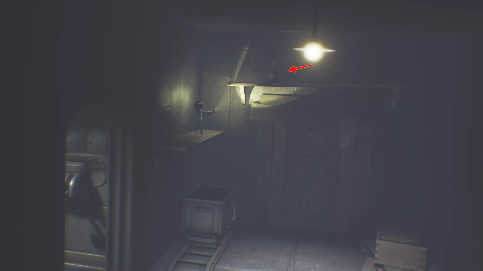 迷失的小生物 5/13 灵光 15 在逃离看守者(那个长手男人)之后的隧道里,会有一盏可以点燃的灯。灯的右侧深处有一个不太显眼的铁架梯子。爬上梯子继续往前走,你会找到隐藏区域。