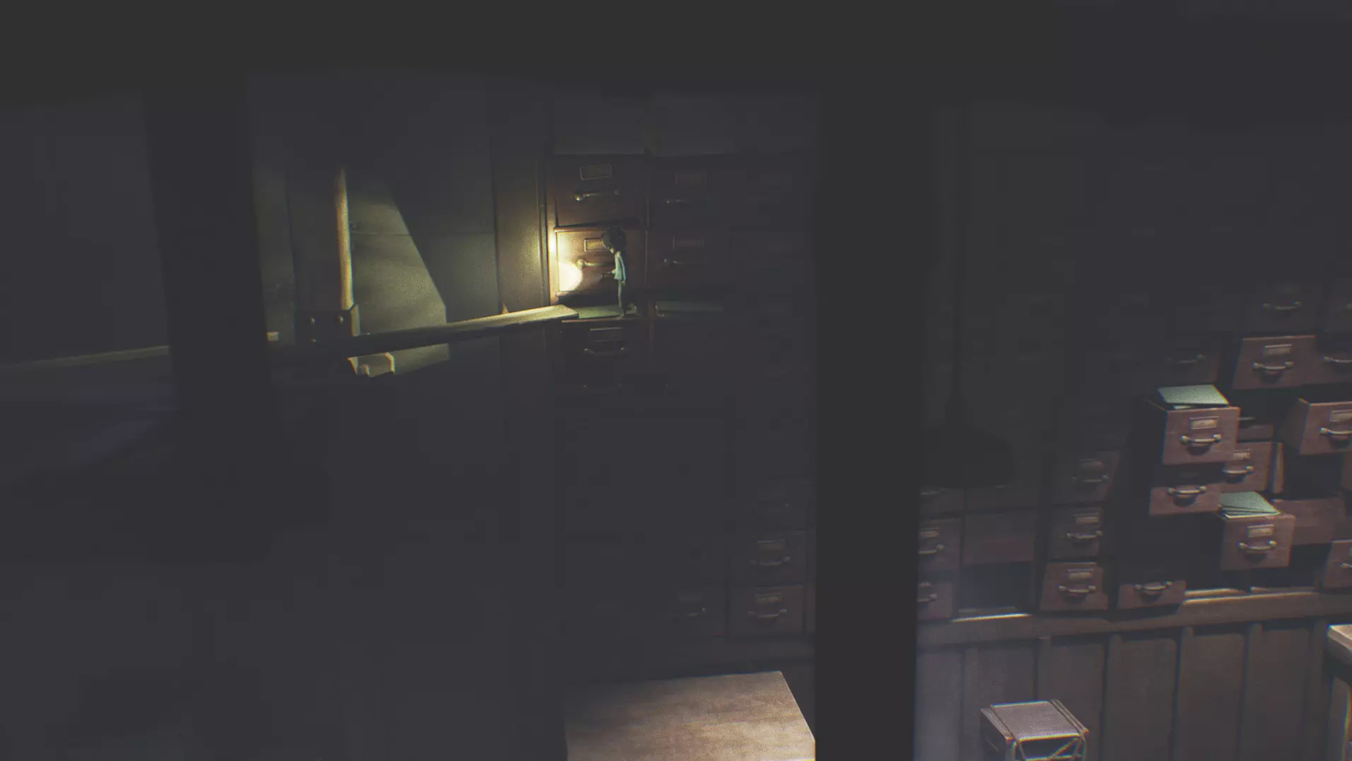 有人在吗?- 3/5 当你乘坐电梯上去后,在档案室里爬到最上层。那里会有一个架子,沿着架子向左走。