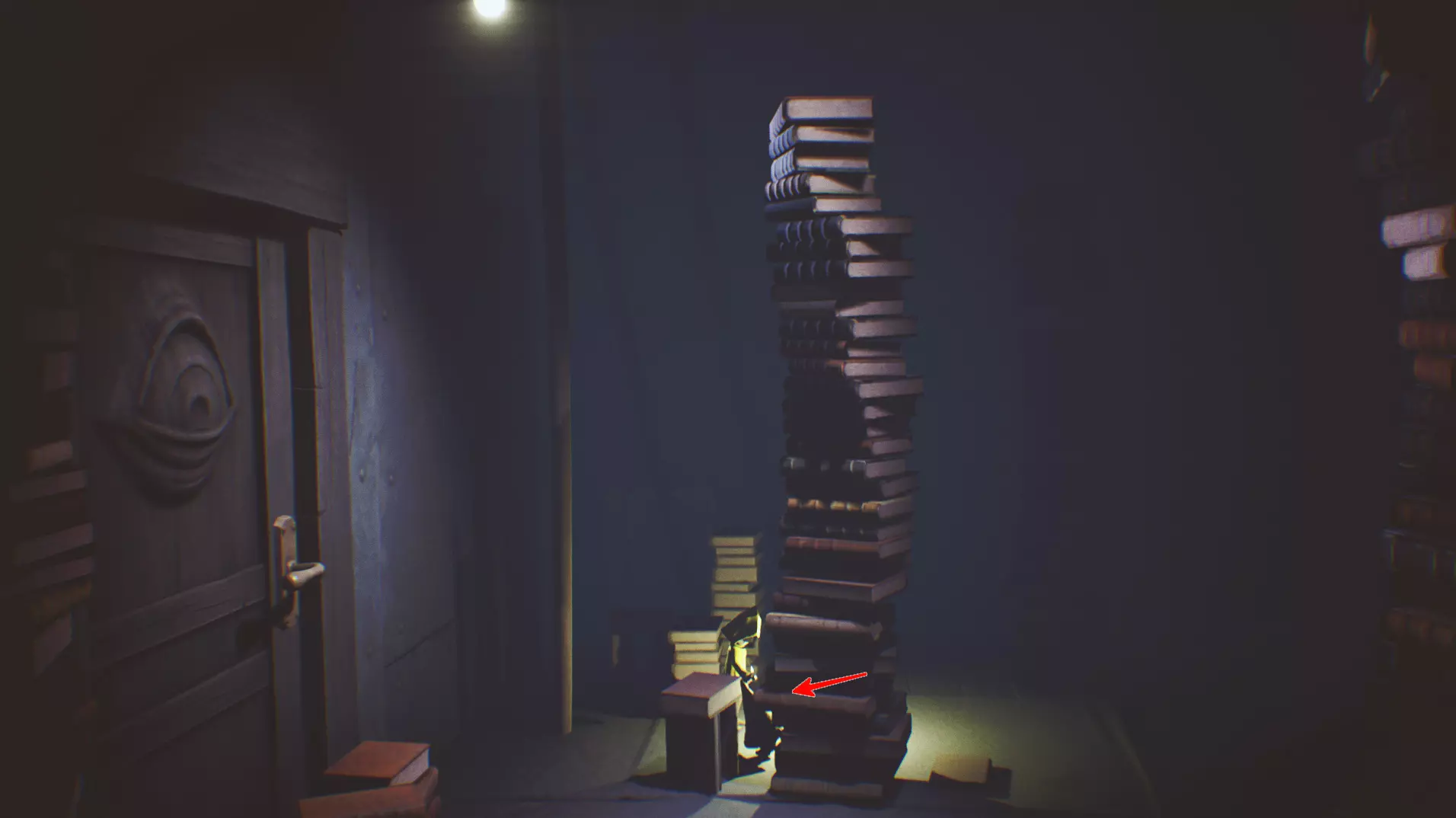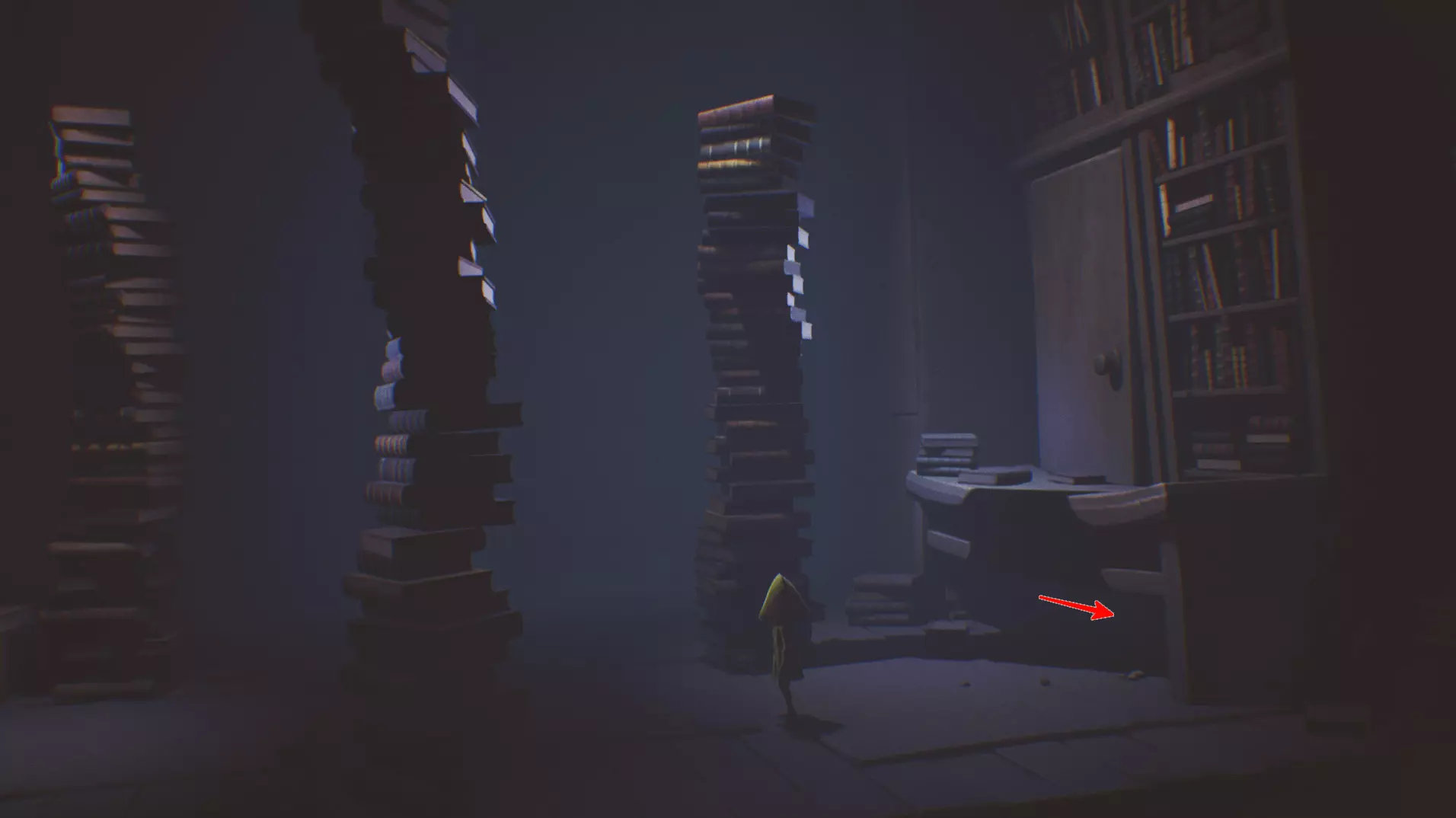 迷失的小生物 6/13 当你进入图书馆时,在右上角的桌子下面藏着一个小家伙。当你吓它一下,它就会向左跑,然后坐在一堆书旁边。