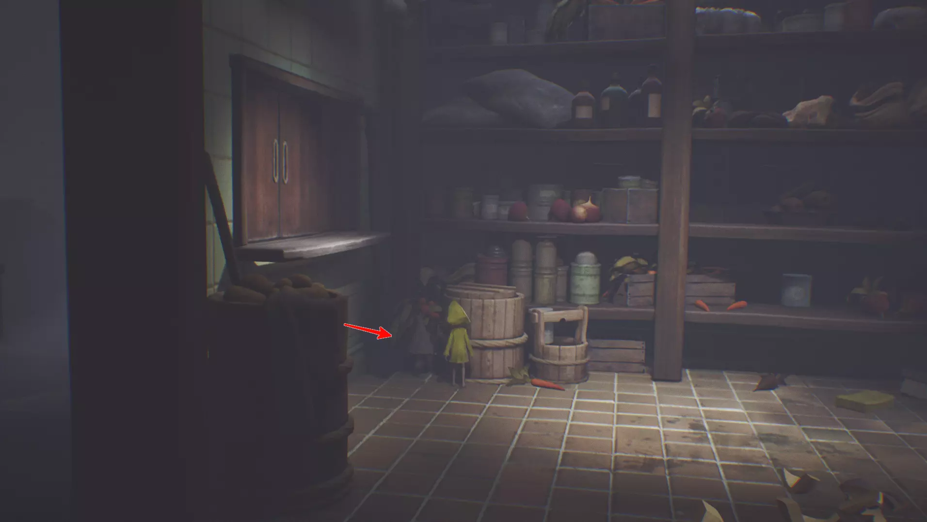 在第一个厨师所在的区域,你可以从有架子的房间或有锅炉的房间里拿取任意食材(例如鱼头),然后扔进锅炉。总共需要扔3个物品。