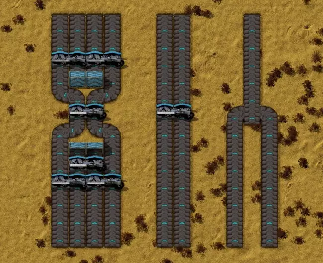 建议使用1-4列车(1个火车头带4节货车)搭配双轨。