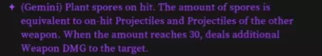 一种以武器为基础的配装,旨在实现持续高射速和孢子触发效果。 配装概述 此配装的核心在于为两把兼容武器获取【双子座孢子】词条。 双子座孢子的作用机制: 每次命中都会对敌人施加叠加式减益效果。当叠加至30层时,孢子会引爆,根据你装备武器的基础伤害造成伤害。优化的关键在于最大化两个武器栏位的投射物数量和射速。