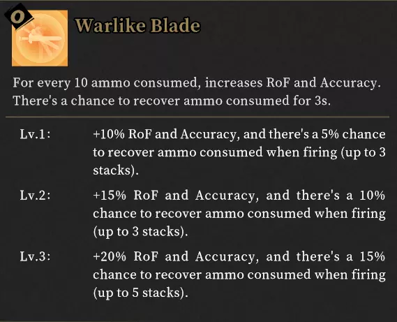 额外协同效果: 大幅提升的射速会同时增加弹药消耗和命中频率,显著增强以下效果: 军火商(从增加的弹药消耗中获益) 无情连击(从增加的命中频率中获益)