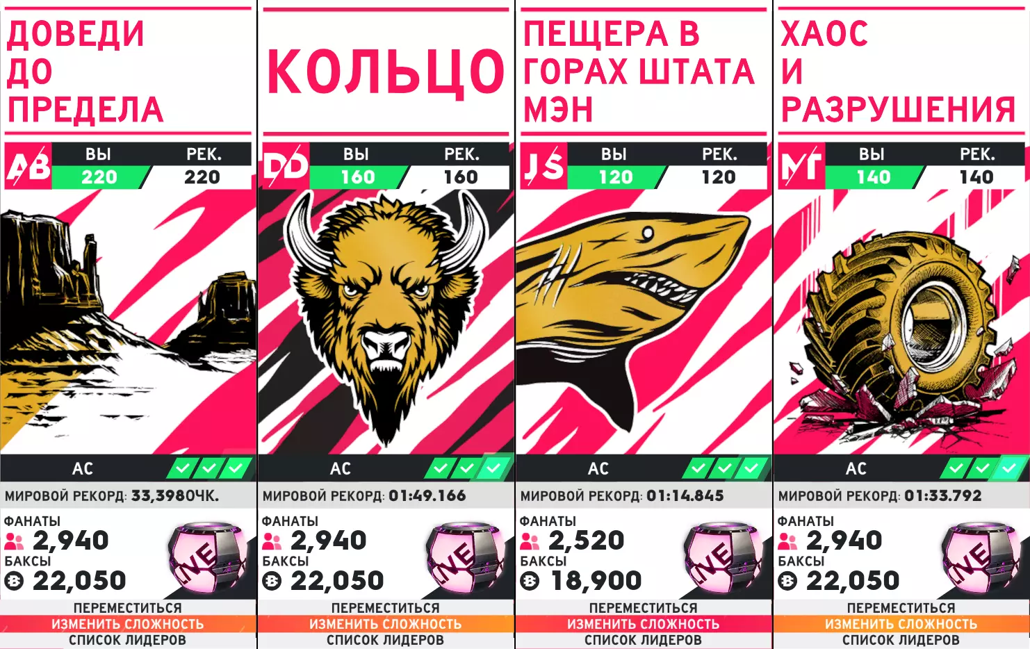 AB - 特技飞行,DD - 演示德比,JS - 喷气冲刺,MT - 怪物卡车