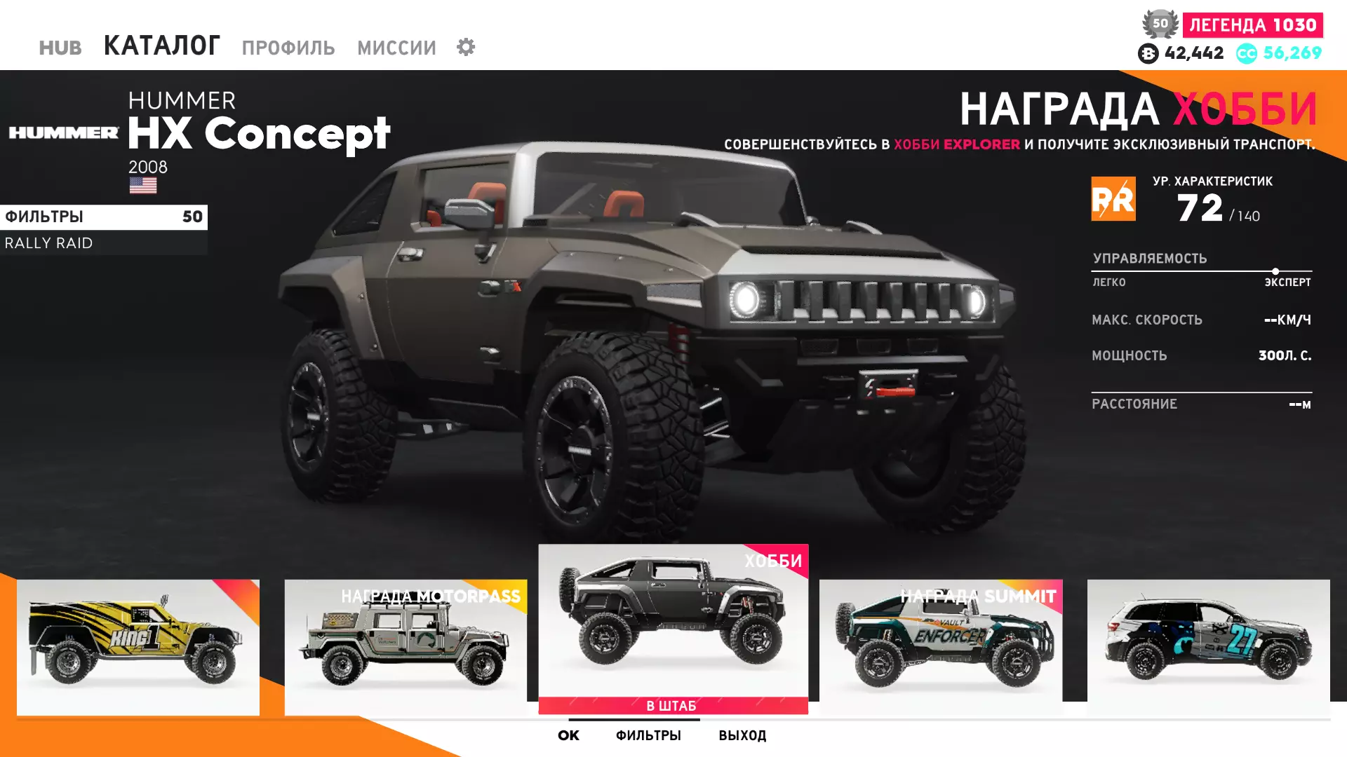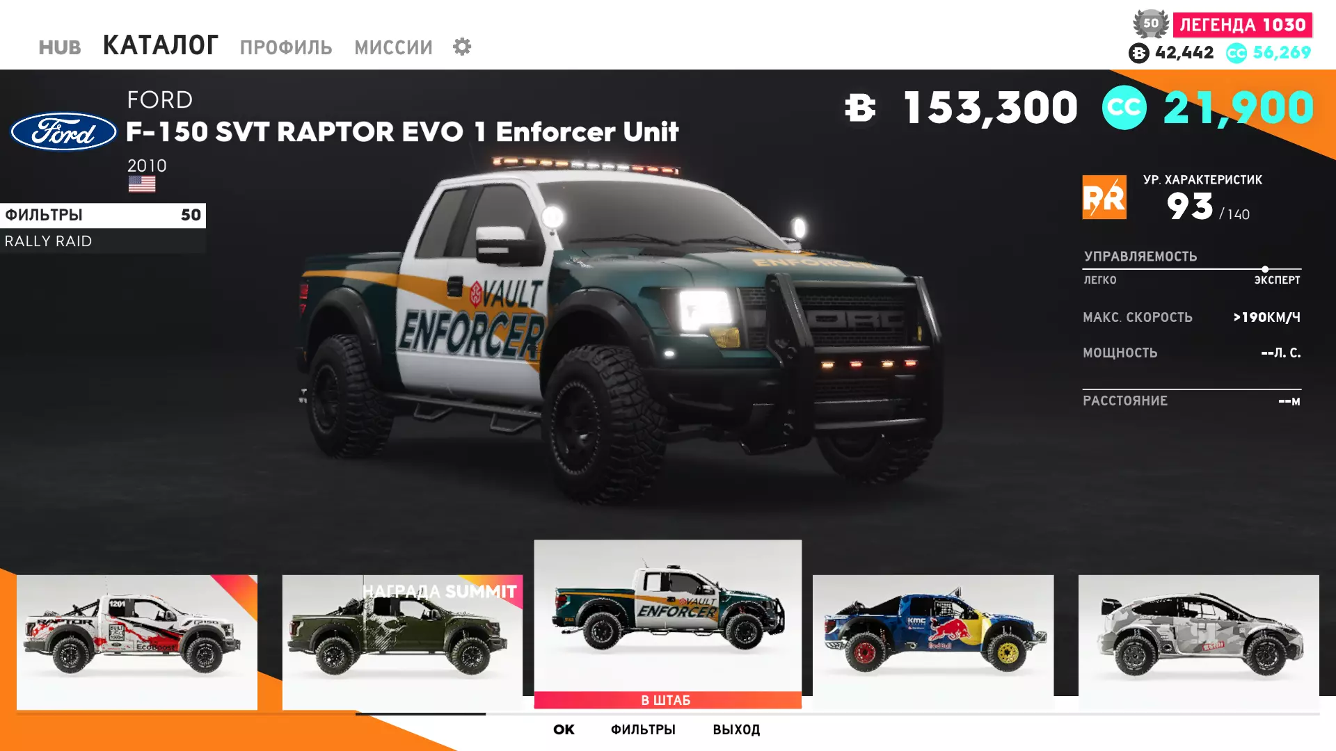 越野拉力赛 在该类别中,有一些比赛需要使用Enforcer车型,因此福特F-150 SVT Raptor EVO 1 Enforcer Unit会是一个通用选择,可谓一举两得。但通常人们更倾向于悍马HX概念车。摩托车方面则有一个选择。