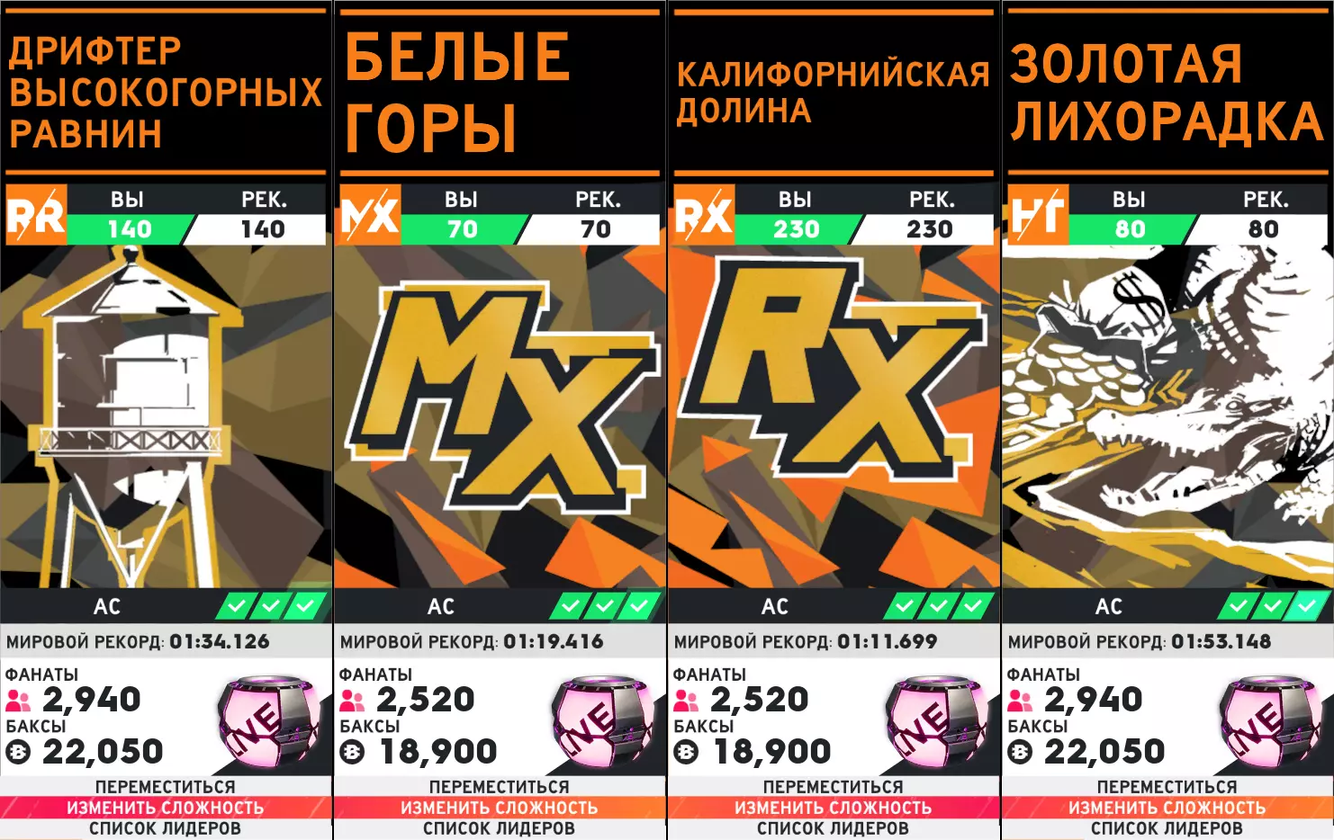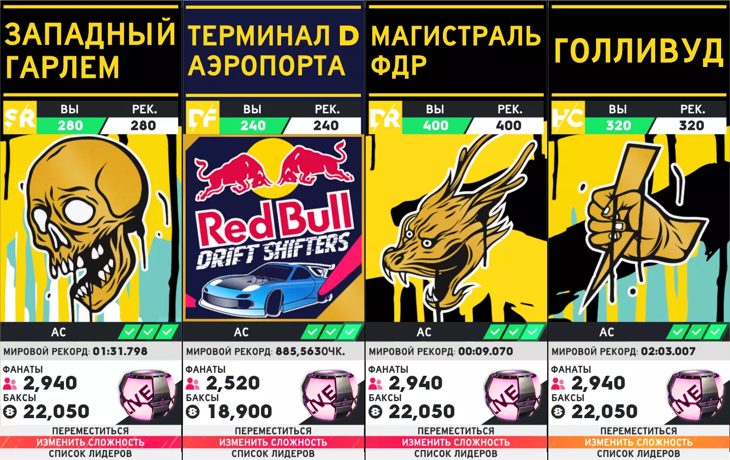 SR - 街头竞速,DF - 漂移,DR - 直线加速赛,HC - 超级跑车