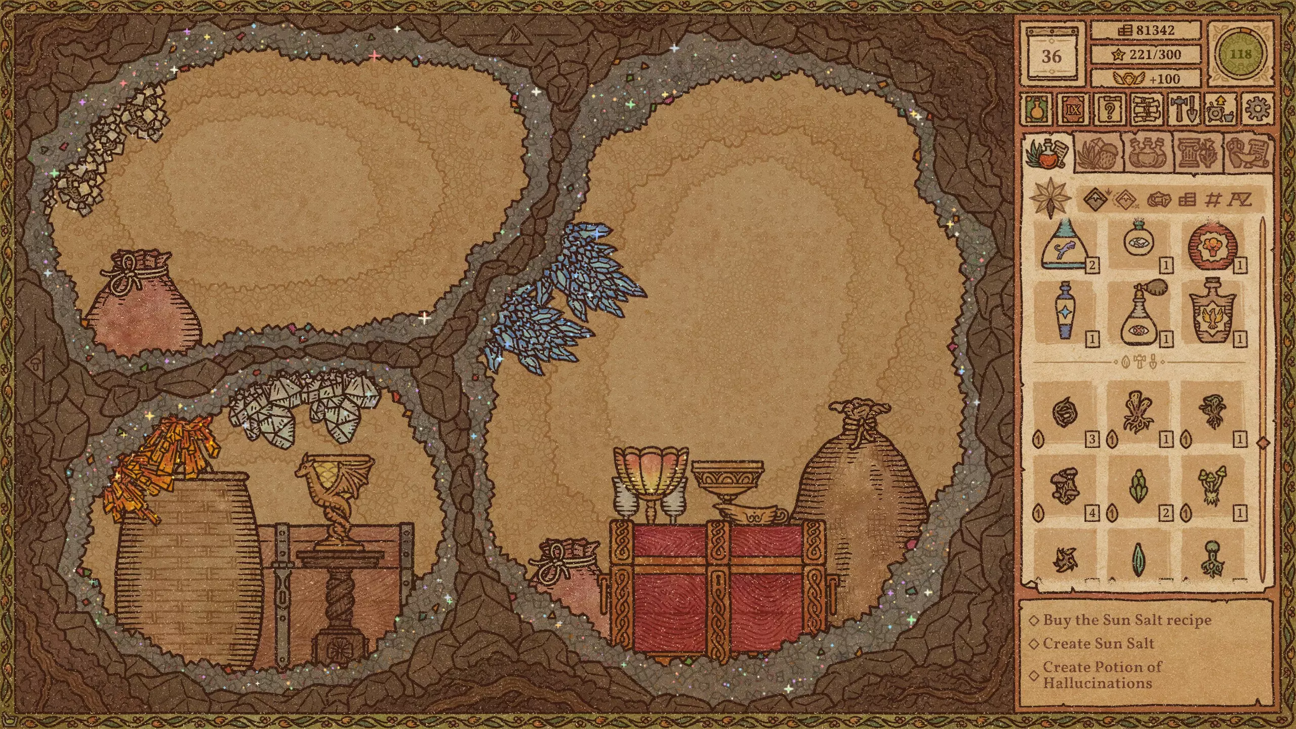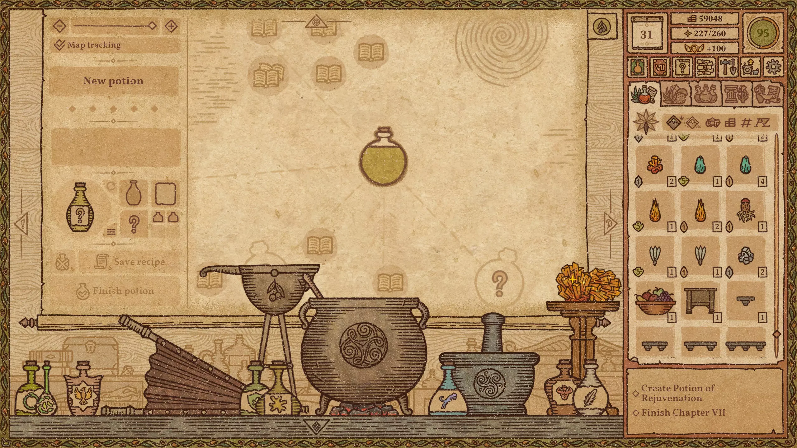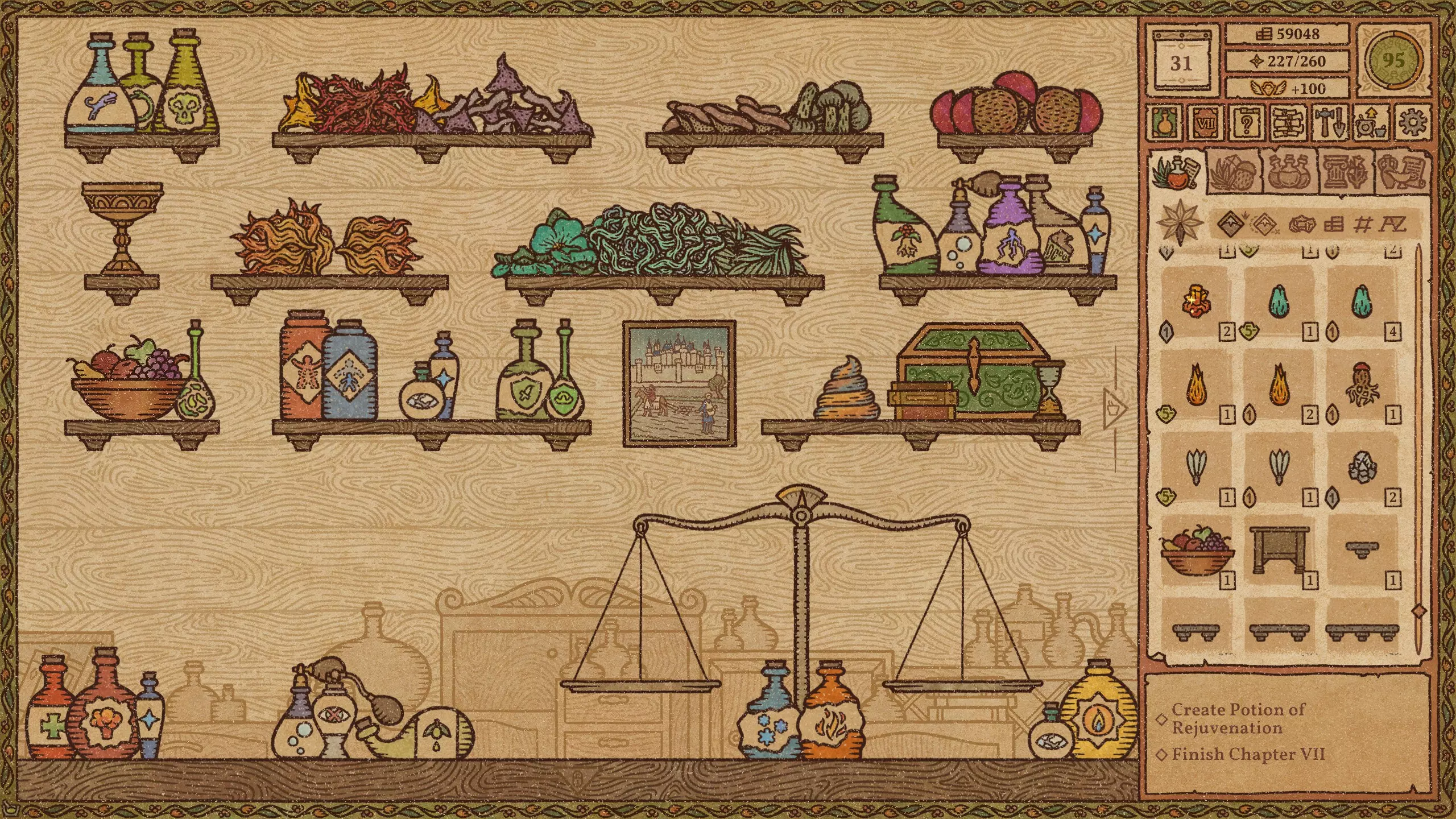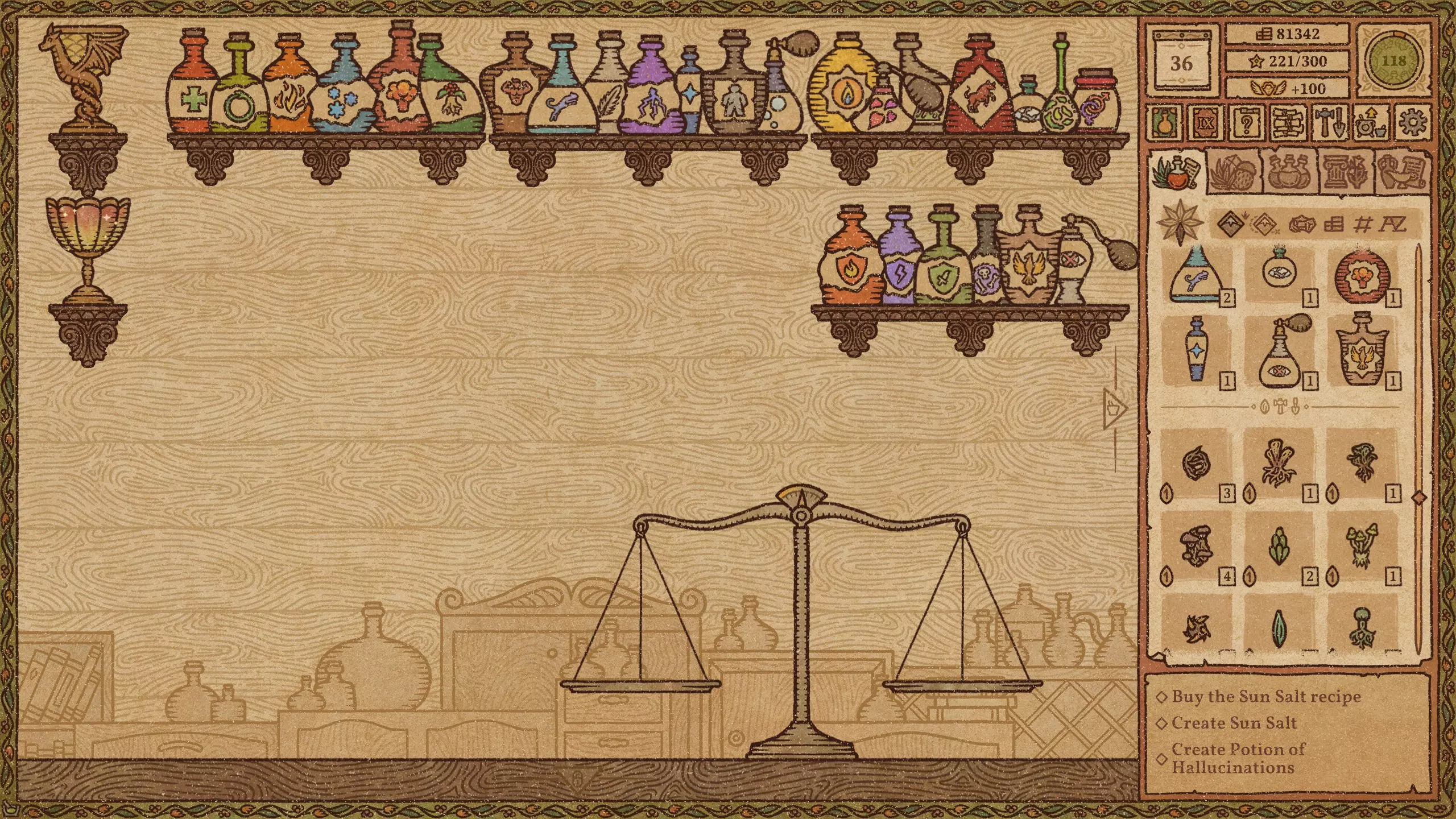 毒药 难度:极易 火焰药剂 难度:简单 提示:前两种材料不要完全研磨。 冰霜药剂 难度:简单 爆炸药剂 难度:中等 野性生长药剂 难度:简单 力量药剂 难度:简单 敏捷药剂 难度:中等 迅捷药剂 难度:简单 提示:前三种材料不要完全研磨。 闪电药剂 难度:简单 水系配方(第2-11天)+ 列表中越靠后的药剂价值越高。 魔力药剂 难度:简单 石肤药剂 难度:中等 提示:离开漩涡后使用长柄勺。 睡眠药剂 难度:简单 光明药剂 难度:中等 魅惑药剂 难度:极难 提示:尝试前保存。水类配方(第11-23天) 列表中位置越靠下的药水,价值越高。 治疗药水 难度:简单 野性生长药水 难度:简单 力量药水 难度:简单 魔力药水 难度:简单 睡眠药水 难度:中等 水类配方(第11-23天)+ 列表中位置越靠下的药水,价值越高。 魅惑药水 难度:中等 迟缓药水 难度:中等 狂怒药水 难度:中等 魔法视觉药水 难度:中等 酸液药水 难度:困难 情欲药水 难度:困难 隐形药水 难度:困难 悬浮药水 难度:困难 死灵药水 难度:困难 幻觉药水 难度:中等 等待油类基底期间 仅在尚未解锁油类地图时使用这些配方。炼金大师通常会在第23天左右出售油基底。 列表中位置越靠下的药水,价值越高。 【防毒药水】难度:极难 【防电药水】难度:极难 【防火药水】难度:极难 【防霜药水】难度:极难 【滑溜药水】难度:极难 油类配方(第23天及以后) 列表中位置越靠下的药水,价值越高。毒素防护药水 难度:中等 闪电防护药水 难度:极难 火焰防护药水 难度:中等 冰霜防护药水 难度:极难 粘性药水 难度:极难 滑溜药水 难度:中等 恶臭药水 难度:极难 酸液防护药水 难度:中等 酒类配方 列表中位置越靠下的药水,价值越高。 幻觉药水 难度:中等 装饰建议 警告!用药水、材料和装饰品填满所有房间会极大地降低游戏运行速度。
