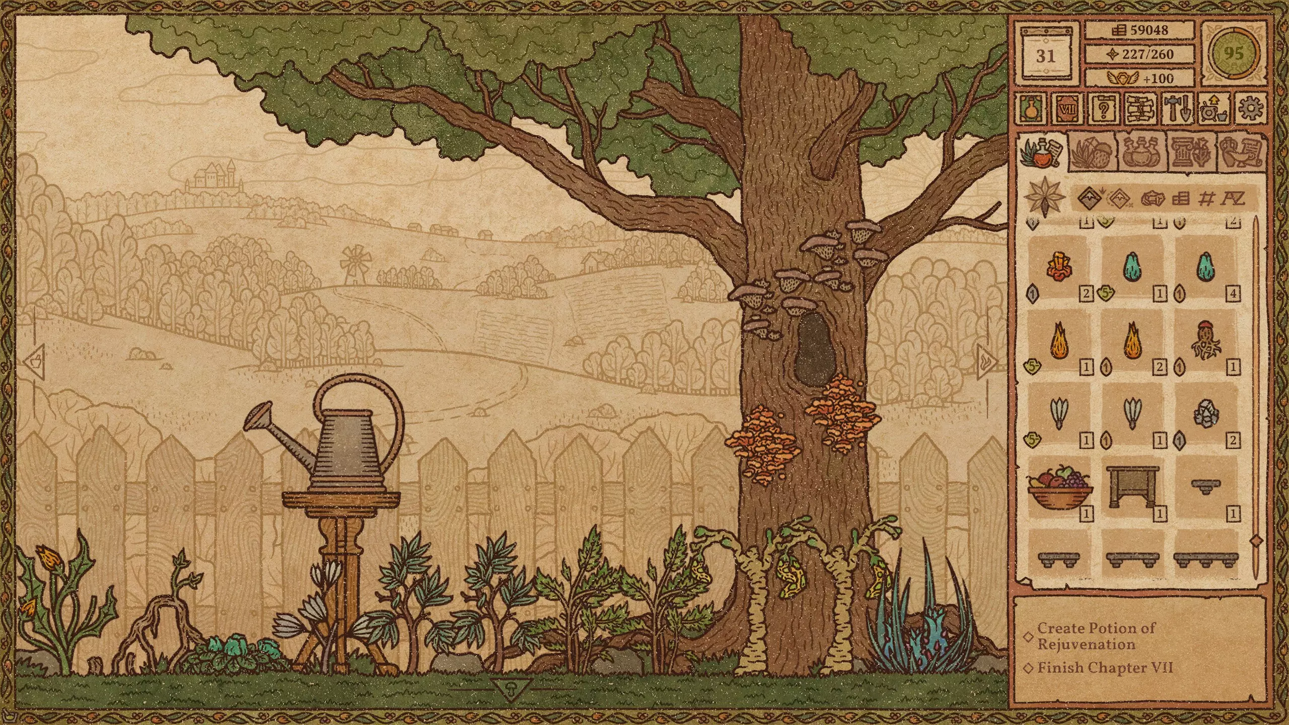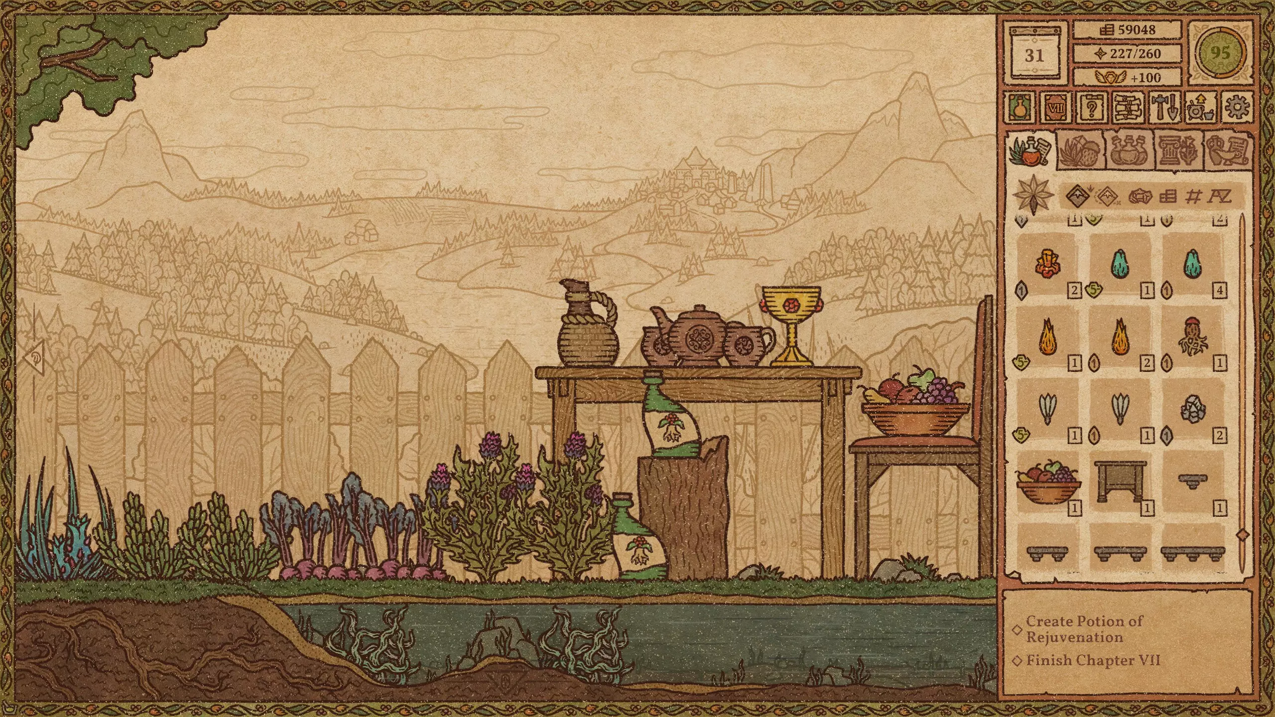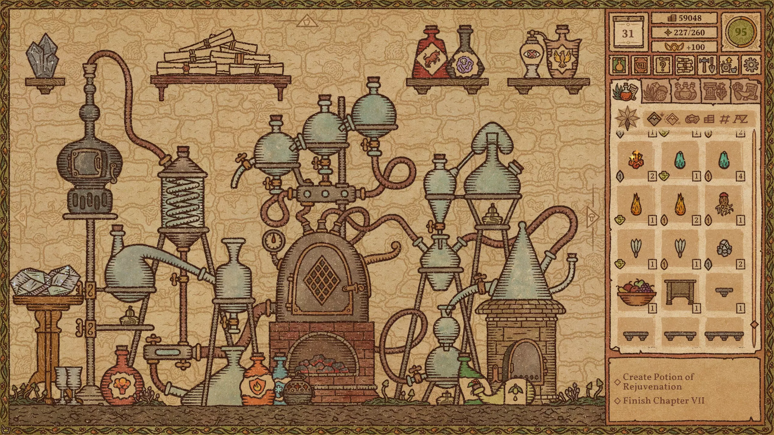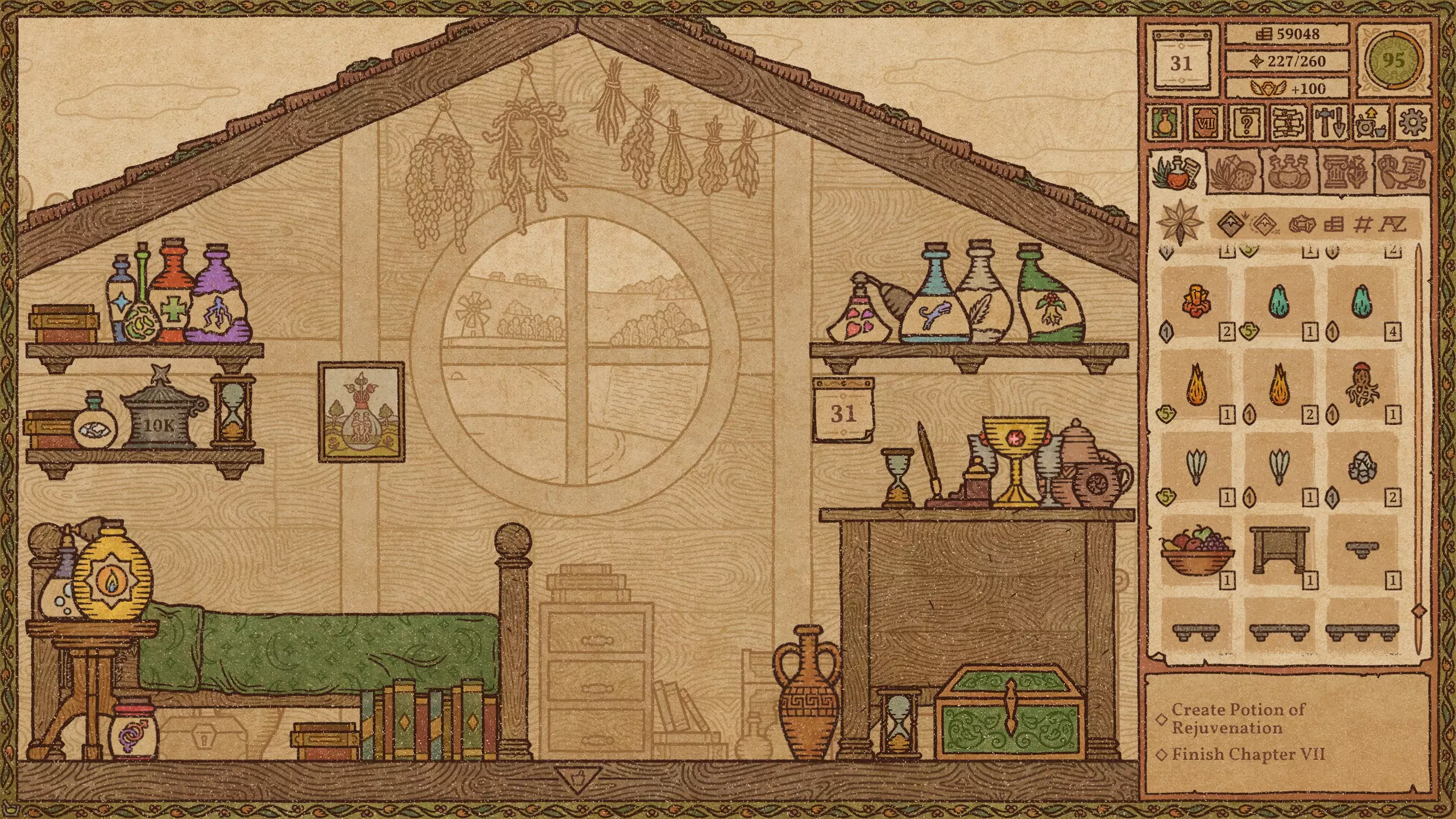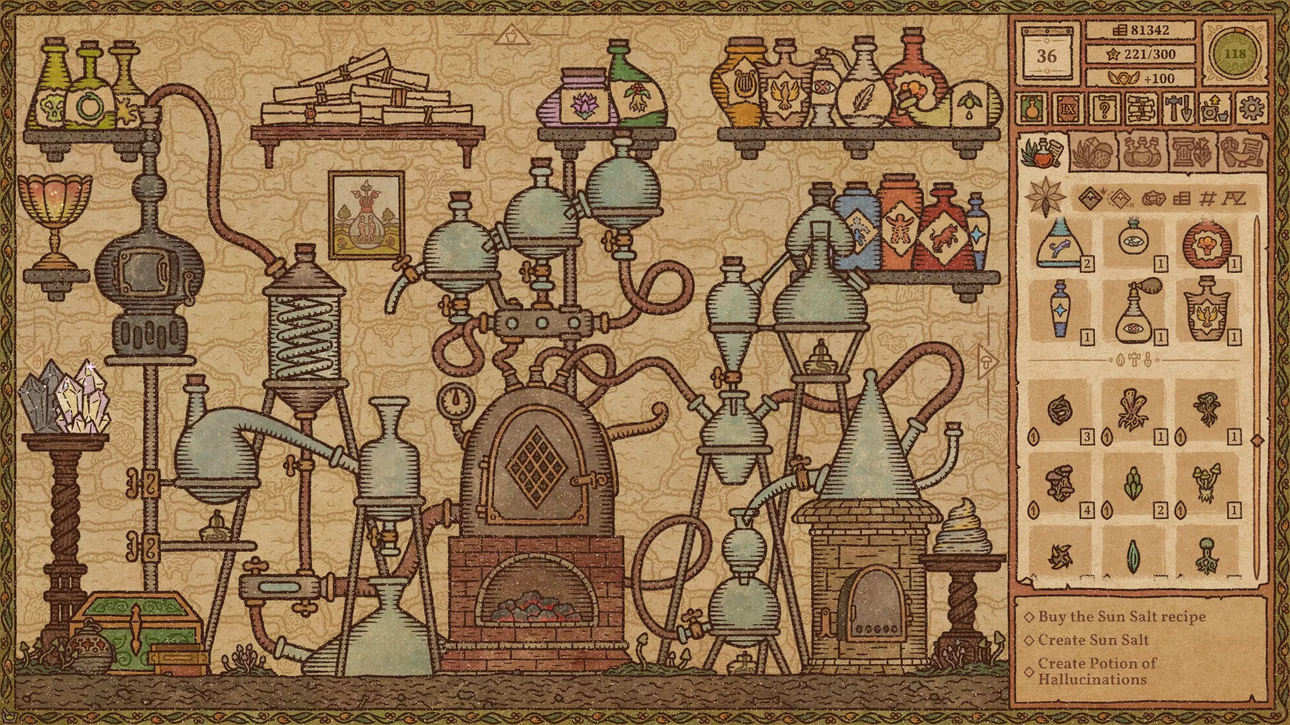 毒药 难度:极易 火焰药剂 难度:简单 提示:前两种材料不要完全研磨。 冰霜药剂 难度:简单 爆炸药剂 难度:中等 野性生长药剂 难度:简单 力量药剂 难度:简单 敏捷药剂 难度:中等 迅捷药剂 难度:简单 提示:前三种材料不要完全研磨。 闪电药剂 难度:简单 水系配方(第2-11天)+ 列表中越靠后的药剂价值越高。 魔力药剂 难度:简单 石肤药剂 难度:中等 提示:离开漩涡后使用长柄勺。 睡眠药剂 难度:简单 光明药剂 难度:中等 魅惑药剂 难度:极难 提示:尝试前保存。水类配方(第11-23天) 列表中位置越靠下的药水,价值越高。 治疗药水 难度:简单 野性生长药水 难度:简单 力量药水 难度:简单 魔力药水 难度:简单 睡眠药水 难度:中等 水类配方(第11-23天)+ 列表中位置越靠下的药水,价值越高。 魅惑药水 难度:中等 迟缓药水 难度:中等 狂怒药水 难度:中等 魔法视觉药水 难度:中等 酸液药水 难度:困难 情欲药水 难度:困难 隐形药水 难度:困难 悬浮药水 难度:困难 死灵药水 难度:困难 幻觉药水 难度:中等 等待油类基底期间 仅在尚未解锁油类地图时使用这些配方。炼金大师通常会在第23天左右出售油基底。 列表中位置越靠下的药水,价值越高。 【防毒药水】难度:极难 【防电药水】难度:极难 【防火药水】难度:极难 【防霜药水】难度:极难 【滑溜药水】难度:极难 油类配方(第23天及以后) 列表中位置越靠下的药水,价值越高。毒素防护药水 难度:中等 闪电防护药水 难度:极难 火焰防护药水 难度:中等 冰霜防护药水 难度:极难 粘性药水 难度:极难 滑溜药水 难度:中等 恶臭药水 难度:极难 酸液防护药水 难度:中等 酒类配方 列表中位置越靠下的药水,价值越高。 幻觉药水 难度:中等 装饰建议 警告!用药水、材料和装饰品填满所有房间会极大地降低游戏运行速度。