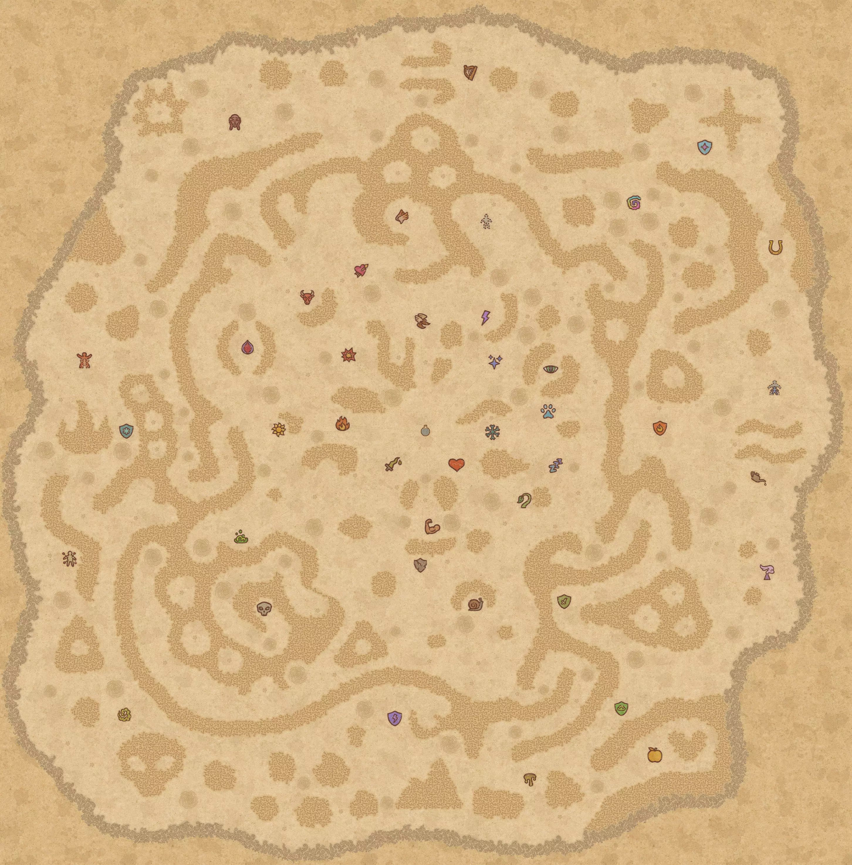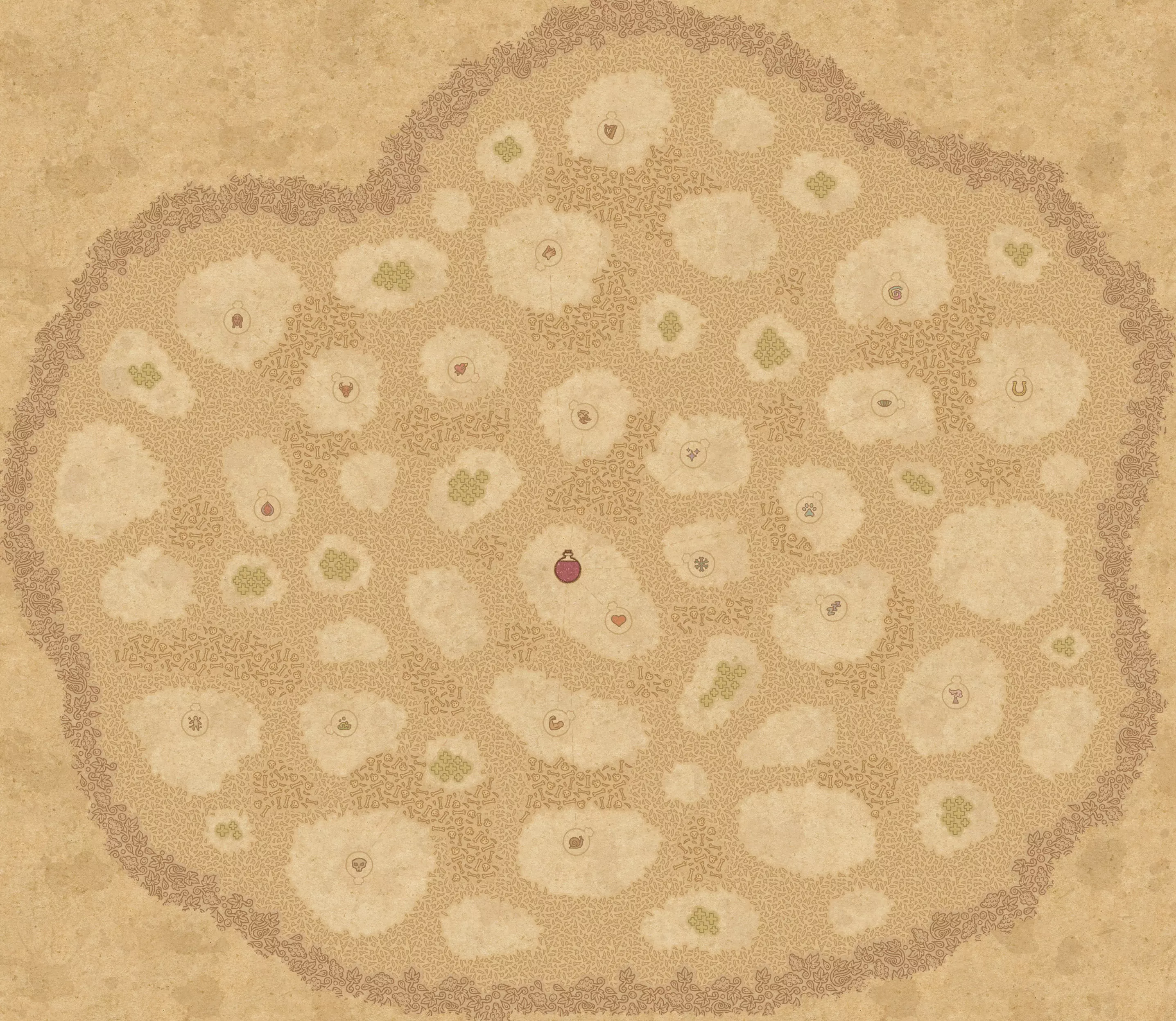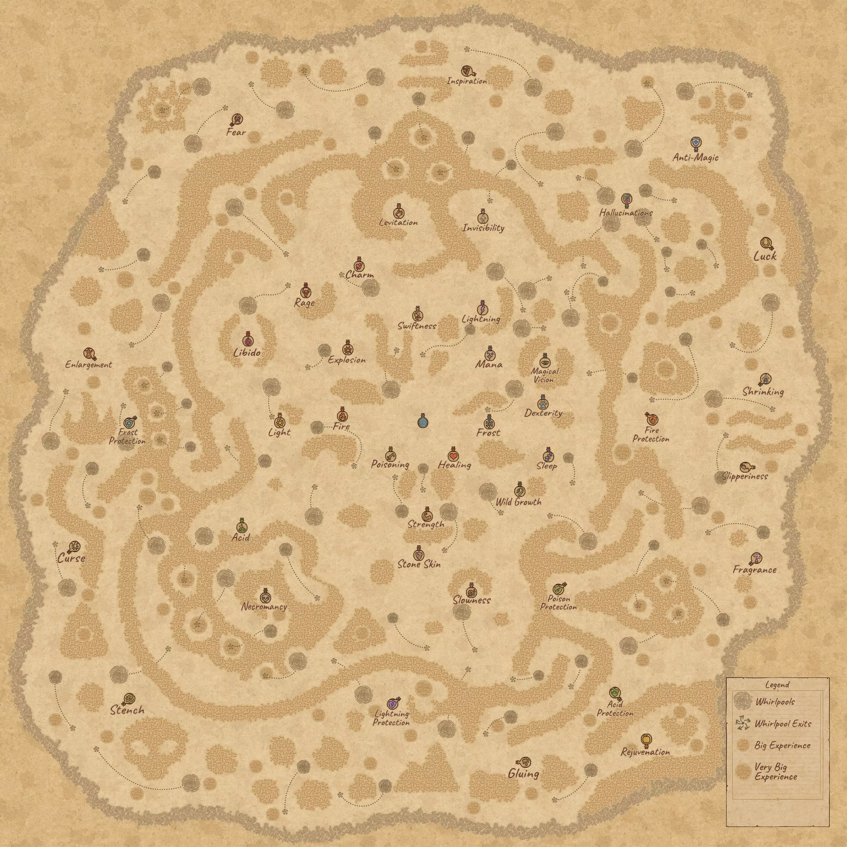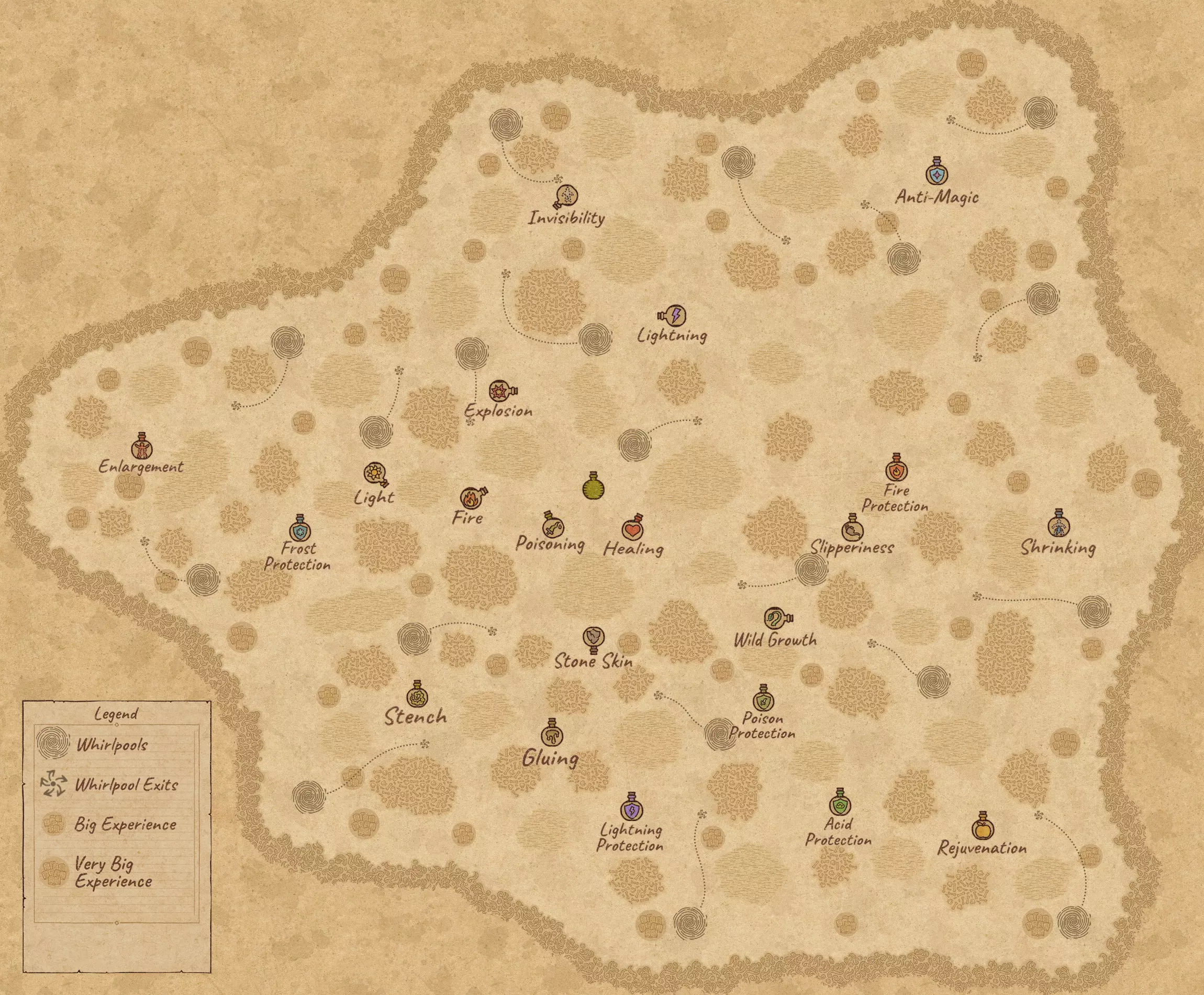完成《药剂工艺:炼金术士模拟器》的地图和药剂配方(含剧透) 注意 如果任何地图消失,请在评论中提及,我会进行修复。 最终会添加酒类配方并更新其余内容。 水之地图 带有标签和漩涡路径的完整水之地图。
