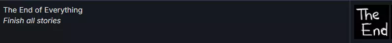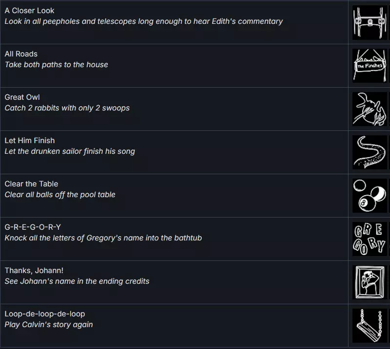 00:00 – 02:02 - All Roads Achievement - 选择两条通往房子的路径 02:03 – 02:48 – 窥视孔 1/10 02:49 – 03:17 – 窥视孔 2/10 03:18 – 04:33 – 窥视孔 3、4 和 5/10 04:34 – 04:59 – 窥视孔 6/10 05:00 – 05:28 – 窥视孔 7/10 05:29 – 06:46 – Great Owl Achievement - 仅用两次俯冲抓住 2 只兔子 06:47 – 09:21 - Let Him Finish Achievement - 让醉酒水手唱完他的歌 09:22 – 10:01 - Clear the table achievement - 清光台球桌上所有的球 10:02 – 11:49 – 窥视孔 8/10 11:50 – 12:32 – G – R – E – G – O – R – Y Achievement - 将格雷戈里名字的所有字母敲进浴缸 12:33 – 13:32 – 窥视孔 9/10 13:33 – 14:08 – 窥视孔 10/10 - A Closer Look Achievement - 查看所有窥视孔和望远镜足以听到伊迪丝的解说 14:09–15:34——【Thanks, Johann!】成就:在结尾 credits 中看到约翰的名字(大约 15:25 处可以看到他的肖像) 15:35–18:18——【Loop – de – loop – de – loop】成就:再次游玩卡尔文的故事(完成游戏并看完 credits 后,会出现重新游玩所有章节的选项,选择卡尔文的章节并再次游玩,完成后即可解锁该成就) 已解锁成就 9/9