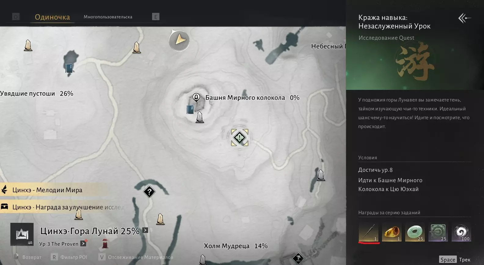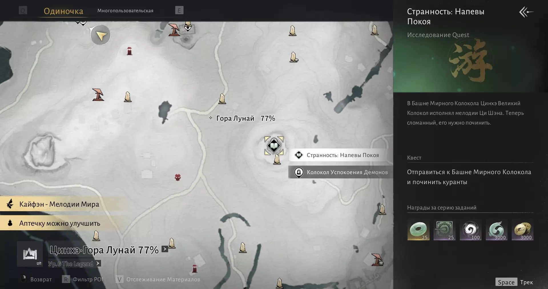 清和 - 旋律探寻者 完成清和地区的150个特殊挑战 这些是奇物(稀有物品)。奇物包括:附魔莲花、匕首将军(铁匠)、低语蜂巢、螳螂。 在探索世界的几乎最开始,你就能遇到它们中的每一个。它们在小地图上以螳螂图标标记。