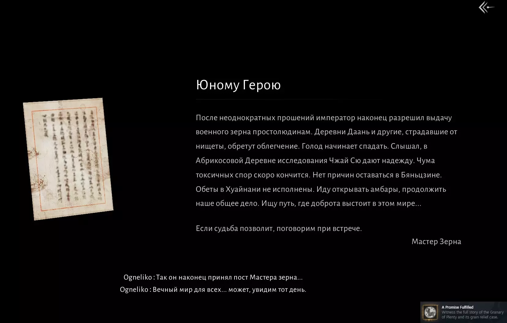 A Promise Fulfilled 见证丰饶粮仓的完整故事及其粮食救济事件 要达成此成就,我们首先需要完成“常平仓”任务(详见“战斗成就”中的“粮仓速通”成就)。 完成任务后,我们需要返回以下地点与NPC对话: