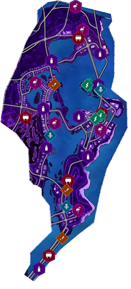 - 6只火烈鸟 - 5处街头艺术 - 3个广告牌 - 2个漂移区域 - 2个速度区域 - 1个跳远 完成后的奖励: 100%区域奖励:贴纸【浆果】+贴纸【叶子标志】(x5) 100%收集奖励:装饰灯效【珊瑚粉波浪】 100%活动奖励:装饰灯效【珊瑚粉闪烁】