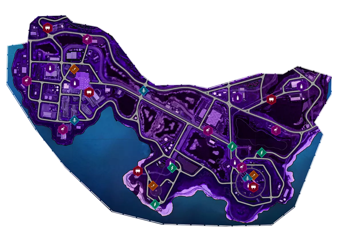 - 6个火烈鸟 - 6个街头艺术 - 4个广告牌 - 3个速度区域 - 3个跳远跳板 - 2个漂移区域 100%区域奖励:【卡车】标志贴纸 100%收集奖励:【粉紫色波浪】灯光 100%活动奖励:【粉紫色闪烁】灯光