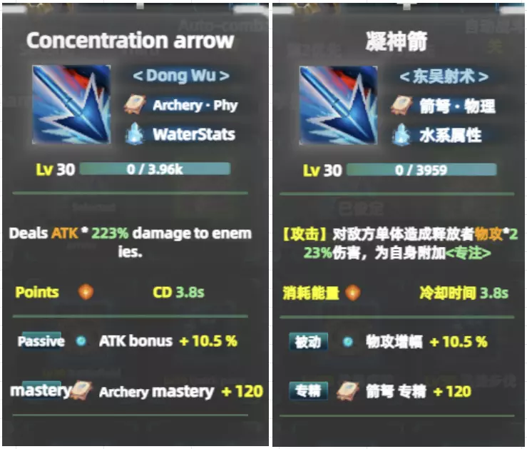 这是一个:物理伤害的、水属性的、箭弩类型的技能。 该技能同时具有物理和水两种属性,箭弩指的是技能类型,而非武器类型。 箭弩专精+120【archery mastery + 120】 这就是升级“专精”所需的经验值。 6.武器类【grasp】