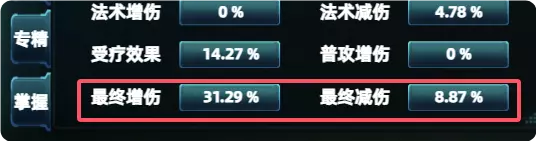 攻击力:1.2,表示:攻击力*120% 速度:1.31,表示:速度*131% 5.攻击、防御、职业之间的关系(攻击*职业)²/(攻击*职业+防御*职业) 注意:这里的攻击是指施法者,防御是指被攻击的目标。 6.最终增伤减伤 最终增伤 最终减伤 【最终增伤】也是一个很强的乘法数值,它要先和【最终减伤】相减,再与其他数值相乘。“最终增伤”同样是一个强效的乘法系数。其计算方式为先减去“最终减伤”,再与其他数值相乘。公式:伤害 * (1 + 最终增伤 - 最终减伤)