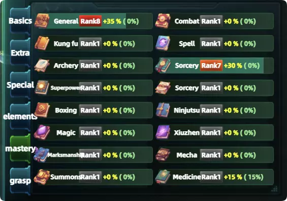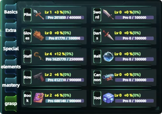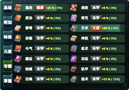 这里面包含了所有技能类型,技能内会标注相应的标签。 专精词条提升需要经验值,相对应的技能可以提供经验值。 5.举例