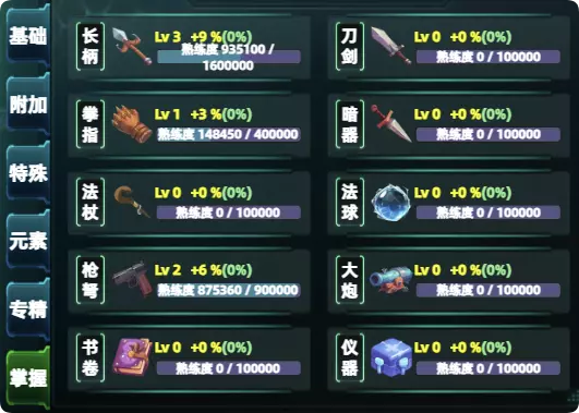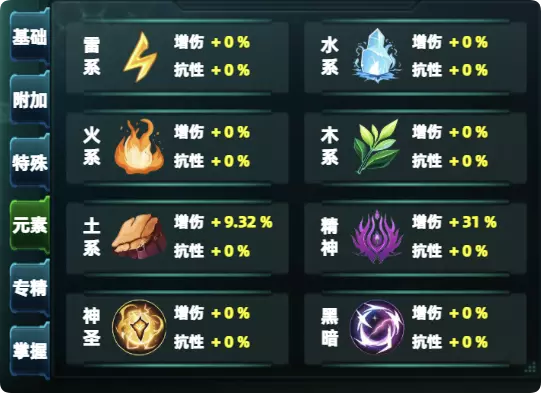 火焰、雷电、神圣、黑暗……,技能内会标注相应的标签。 4.专精类【mastery】