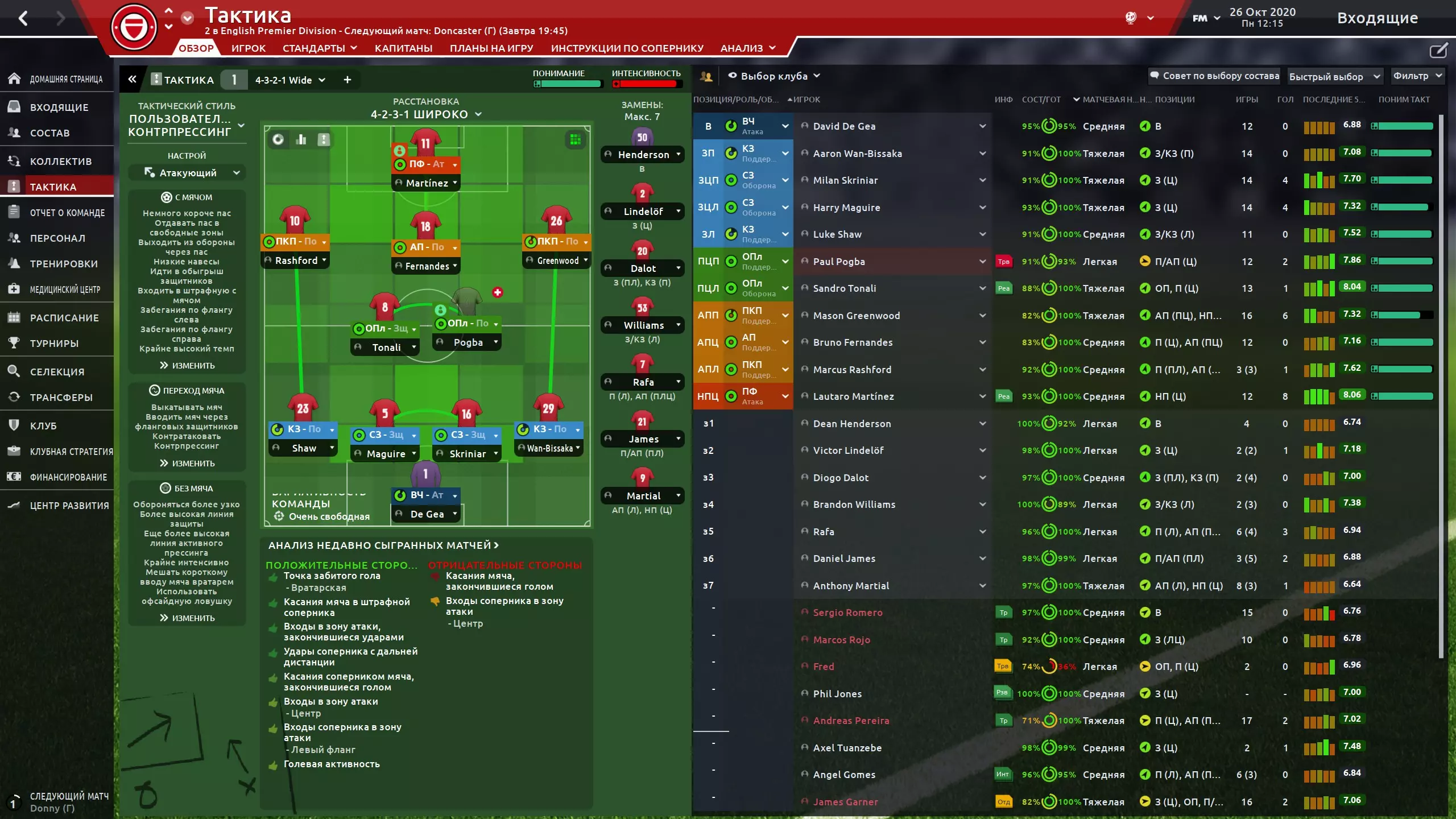 而且所有这些战术全是滥用,和足球毫无关系。千篇一律的进球,愚蠢的传中,大量的进球机会都来自角球和点球。每年都能找到引擎漏洞,然后就开始滥用。 因为我更喜欢看完整的比赛或者详细的复盘,所以比赛本身的场面和进程对我来说很重要。当看到球员们展现出多样的跑位、精彩的传球配合,以及球场上没有球员做出不合理行为时(在游戏引擎的限制范围内),我会感到一种审美上的愉悦。 战术 接下来直接谈谈我呕心沥血制定的战术。 我曾经钟爱的经典4-4-2阵型早已过时,因此现在采用4-2-3-1阵型。我执教的是处于严重危机中的曼联。
